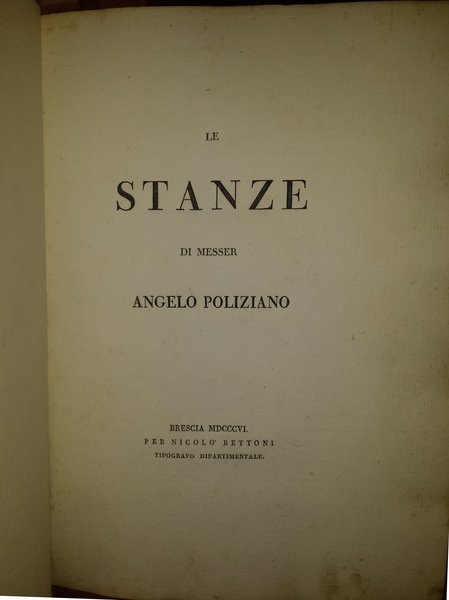 In-4 (31 cm) 96 (2). Mezza pergamena dipinta di verde. Elegantissima edizione impressa con gran cura dal Bettoni su carta forte a larghi margini, dedicata all'amministrazione municipale di Brescia agli sposi Eugenio Napoleone vice-Re d'Italia ed Amalia Augusta di Baviera. Bell'esemplare in condizioni perfette tranne rare arrossature a qualche margine bianco.In-4 (31 cm) 96 (2). Half parchment painted green. Very elegant edition printed with great care by Bettoni on strong paper with wide margins, dedicated to the municipal administration of Brescia to the spouses Eugenio Napoleone Vice-King of Italy and Amalia Augusta of Bavaria. Beautiful specimen in perfect condition except for rare reddening with some white margin.