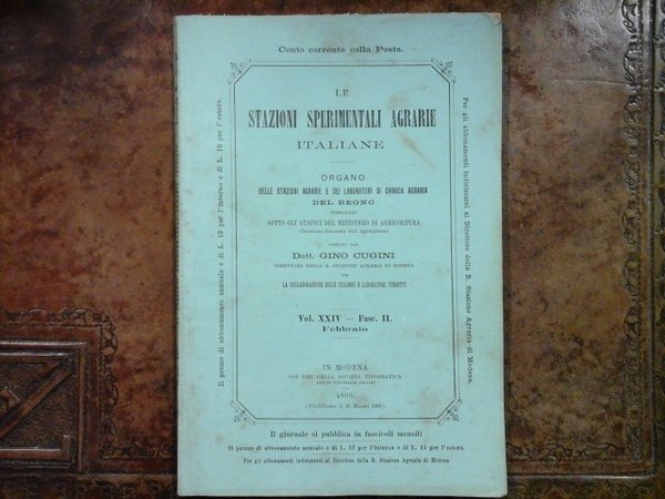 Le Stazioni Sperimentali Agrarie Italiane. Vol. XXIV - Fasc. II. Febbraio. Organo delle stazioni agrarie e dei laboratori di chimica agraria del Regno. Pubblicato sotto gli auspici del Ministero di Agricoltura (Direzione generale dell'Agricoltura). Diretto dal Dott. Gino Cugini, Direttore della Regia stazione Agraria di Modena con la collaborazione delle stazioni e dei laboratori suddetti