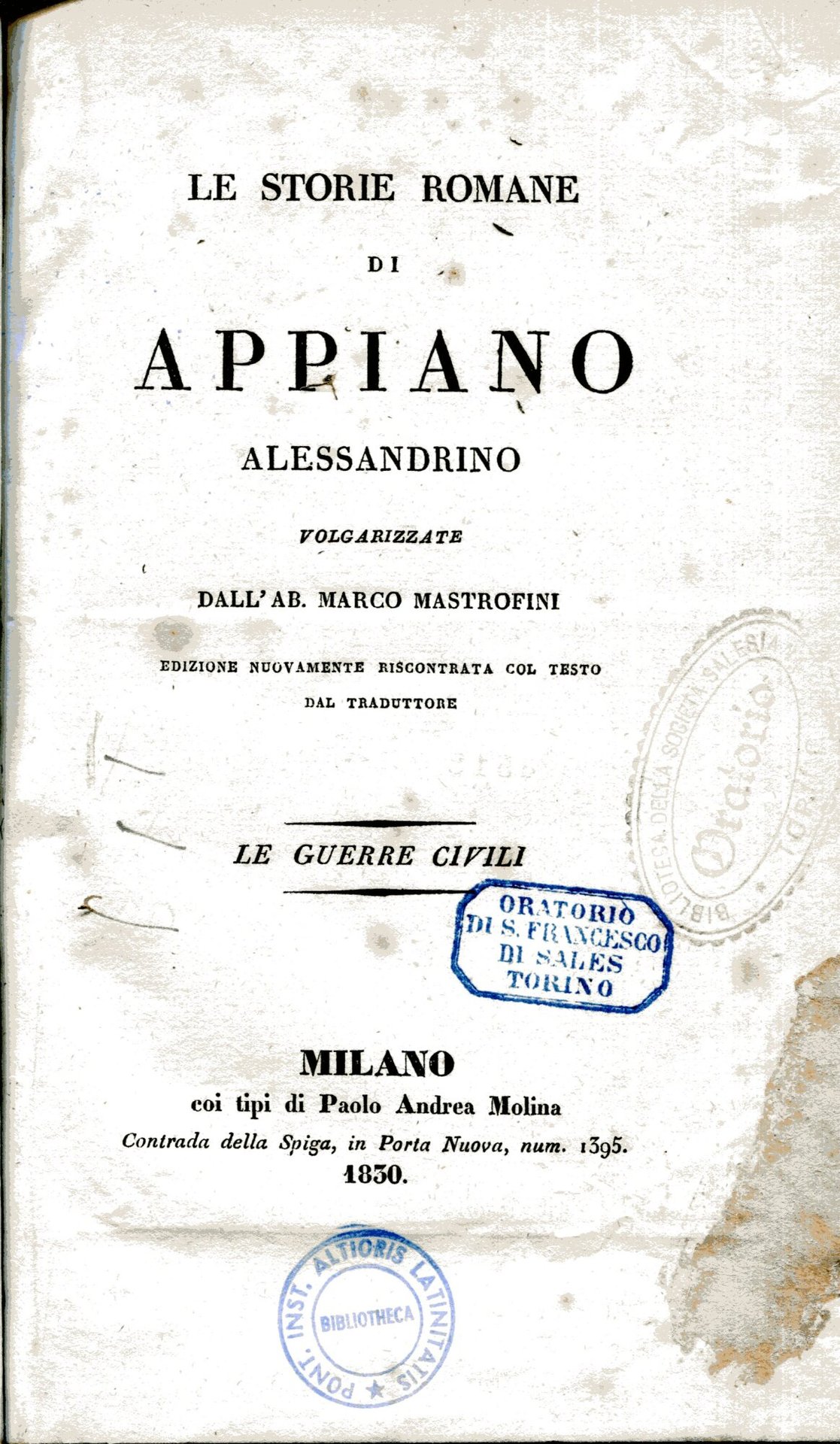 Le storie romane di Appiano Alessandrino volgarizzate dall'ab. Marco Mastrofini. Le guerre civili. Edizione nuovamente riscontrata col testo dal traduttore