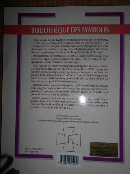 BERNARD MARILLIER. France, Pardès, 1997. Le Svastika. Symbole du feu bénéfique céleste, le svastika fait tourner le monde dont il représente le deux poles opposés. In-8°, br. edit. ill. a col. 96 pp. con numerose illustrazioni in bianco e nero n.t. Come nuovo. Uff. stanzetta mob. piccolo a destra.