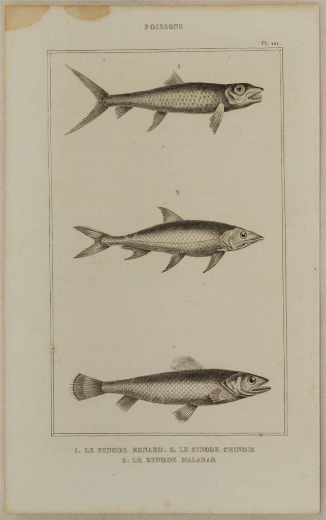 Bella incisione probabilmente della metà del XIX secolo tratta dalla monumentale opera di storia naturale di Buffon, carta spessa. L'incisione rappresenta tre specie di Synodus tra i quali il Synodus malabaricus. In buone condizioni, fioriture. Usure al margine sinistro e gora d'umidità. TECNICA: Incisione DIMENSIONI FOGLIO: cm 20x12,5 DIMENSIONI INCISIONE: cm 14x9 EPOCA: 1850 circa Buffon fu un'esponente del movimento scientifico legato all'illuminismo e le sue teorie influenzarono le generazioni successive di naturalisti in particolare Jean Baptiste Lamarck e Charles Darwin. Questa è la sua opera più celebre ed è l'"Histoire Naturelle" pubblicata per la prima volta tra il 1749 ed il 1789 in 36 volumi di cui 8 postumi grazie al lavoro di Bernard Lacepede. Buffon espone tutto il sapere dell'epoca nel campo delle scienze naturali e proprio in questo scritto rilevò le somiglianze tra l'uomo e la scimmia e la possibilità di una genealogia comune.Nice engraving of probably half of the XIX century, taken from the monumental work of natural history by Buffon, wide paper. The engraving represents three species of Synodus between them the Synodus malabaricus. In good conditions, foxings. Wearings in the left edge and slight humidity stain. TECHNIQUE: Print LEAF SIZE: cm 20x12,5 PRINT'S SIZE: cm 14x9 PERIOD: 1850 circa Buffon was an exponent of the scientific movement connected to illuminism and his theories inspired the next generations of naturalists in particular Jean Baptiste Lamarck and Charles Darwin. His most famous work is l'"Histoire Naturelle" published for the first time between 1749 and 1789 in 36 volumes of which 8 are posthumous thanks to the work of Bernard Lacepede. Buffon exposes in the work all the notions in natural history and in this writing in particular underlined the similarity between monkeys and man with a possibility of common genealogy.