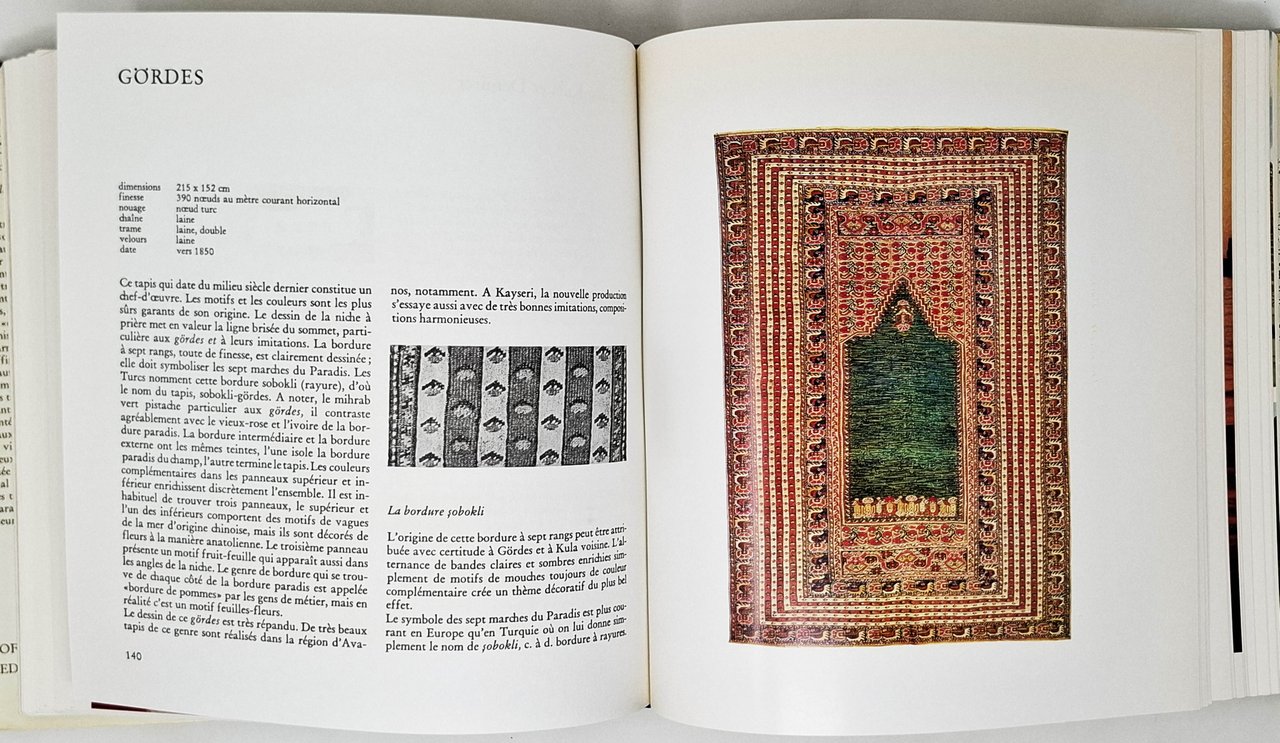 Lingua del testo francese. Traduction francaise: Cléon Séraidaris. Traduction de l'avant-propos et de l'Introduction: Christine Leuthardt. 258 illustrations dont 179 en couleur, 8 cartes. Pagine: 354. Formato: 25,5 x 26 cm circa. Stato di conservazione: segni del tempo e dell'utilizzo sulla sovraccoperta ma volume in ottimo stato di conservazione. Per un errore editoriale, l'autore e l'editore, sul dorso della copertina, spo o stati impressi (in oro) al contrario. Copertina editoriale cartonata rigida in tutta tela blu con titoli in oro sul dorso e sovraccoperta illustrata a colori. Magnifiche le tavole fotografiche a colori, riproducenti i vari tappeti, nel testo.