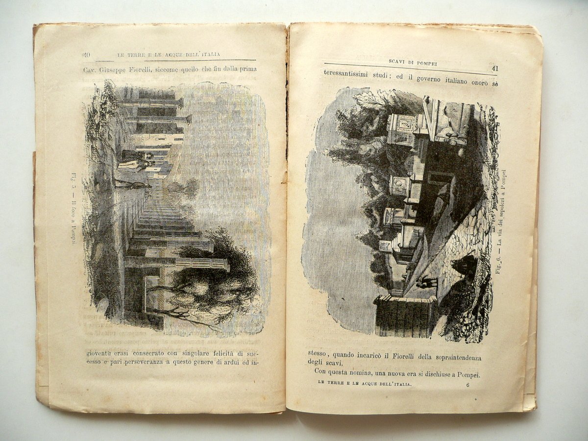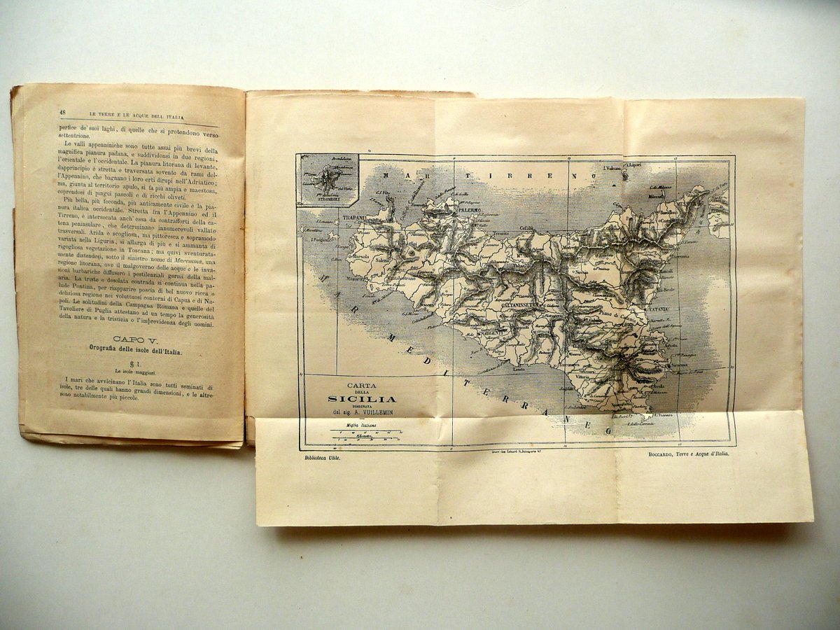 Prof. Gerolamo Boccardo, Le terre e le acque dell'Italia saggio popolare elementare di geografia fisica di questa contrada del Prof. Comm. Gerolamo Boccardo Presso gli Editori della Biblioteca Utile, Milano 1865, cm 19x12,5, pp. 140 con 14 belle fig. incise in b/n nel t. e fuori t. (qualcuna su due pagine), due carte rip. pi√π volte fuori t., dell'Italia e della Sicilia (rispettivamente con dettagli a col. e in b/n) e una tavola a col. fuori t.; brossura ed. Condizioni di conservazione Esemplare complessivamente ben conservato con tracce d'uso e qualche piccola lieve brunitura; brossure con lievissime tracce di sporco e un paio di leggere annotazioni a matita; margini e angoli con piccole pieghette, pochi minimi strappetti e una minuscola mancanza; dorso con un paio di fessurazioni, uno strappetto di alcuni cm e una piccola mancanza alla cuffia inf.; cuciture dei fascicoli lievemente allentate. Angoli di qualche pagina con una minima pieghetta; carta a col. dell'Italia con un piccolo strappetto al margine int. Con 14 belle figure in bianco e nero nel testo e fuori testo (qualcuna su due pagine), due carte ripiegate pi√π volte fuori testo (una dell'Italia, una della Sicilia), e una bella tavola a colori fuori testo. SETT98.L9249 N P