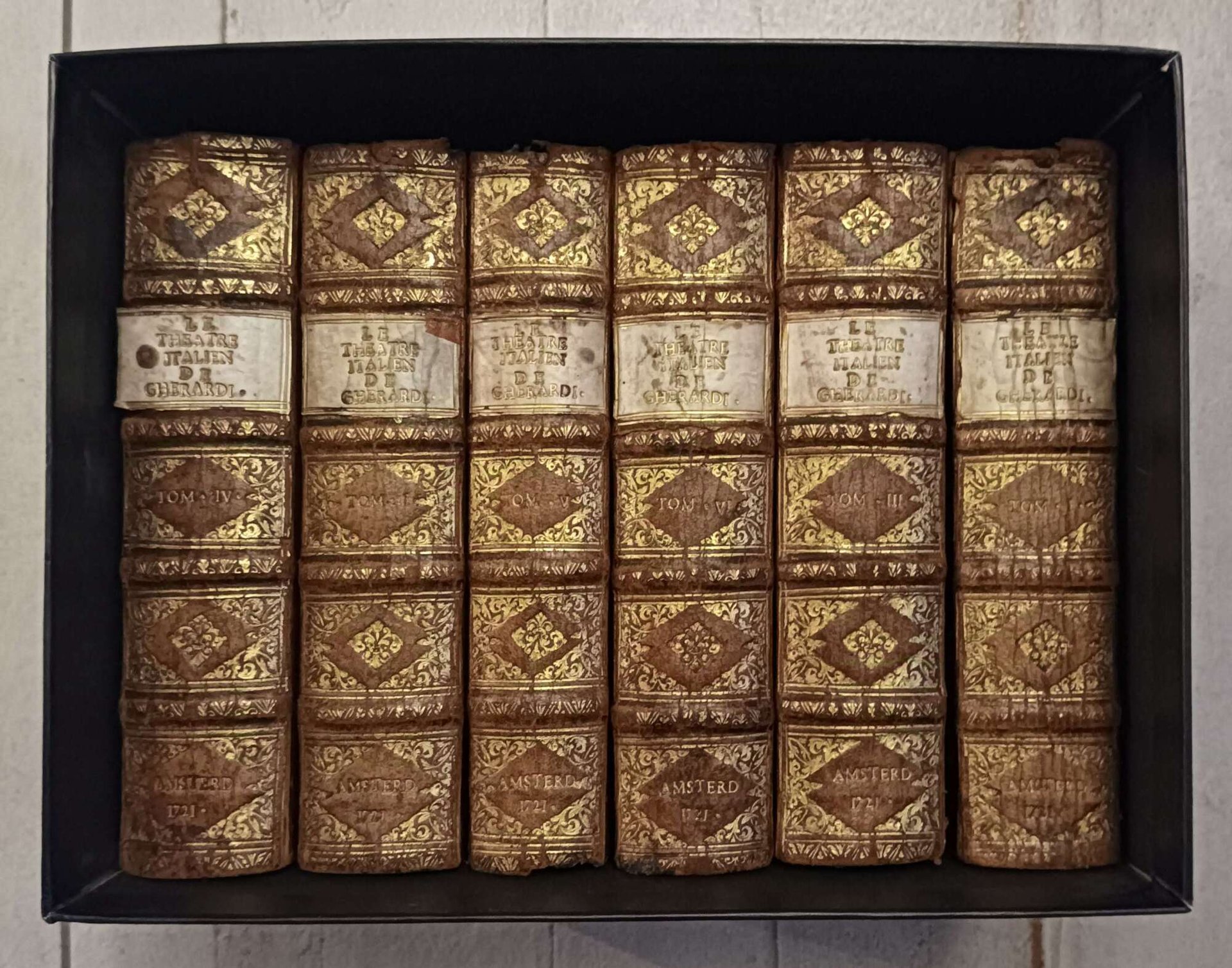 >6 volumi in-12, pp. (4), XIX, (1), 472, 16 di spartiti musicali, 12 tavole fuori testo; pp. (4), 514, (2), 10 tavole; (4), 561, (3), 8 di spartiti musicali, 9 tavole fuori testo; pp. (4), 561, (3), 8 di spartiti musicali, 9 tavole fuori testo; pp. (4), 524, 10 tavole fuori testo, 36 di spartiti musicali; pp. (4), 460, 10 tavole fuori testo, 24 di spartiti musicali; pp. (4), 512, 9 tavole fuori testo, 40 di spartiti musicali. Ogni volume presenta antiporta calcografica, frontespizio stampato in rosso e nero e graziosissime tavole calcografiche in apertura di ciascuna commedia, in fine, gli spartiti musicali delle arie delle commedie. Bella legatura in pieno vitello, dorso a nervi riccamente decorato in oro, titolo in oro su tassello in pergamena al dorso. Quinta edizione. Duchartre (in ''La Comédie italienne'', Paris, 1924) dedica un intero capitolo (pp. 89-96) a ''Le théâtre de l'Arlequin Gherardi ou Comédies françaises accomodées au Théâtre Italien: Répertoire de la comédie italienne en France (de 1682 à 1697)", ed afferma: "L'Arlequin Evariste Gherardi a réuni en six volumes une quarantaine de canevas à l'italienne, mêlés de textes écrits par une douzaine d'auteurs français. Chaque pièce forme un curieux entrelac de langue française et italienne...''. L'opera si segnala agli appassionati e studiosi di teatro, sia per l'apparato iconografico e musicale, sia per la quantità, rarità ed importanza delle ''pièces''. Ottimo esemplare.