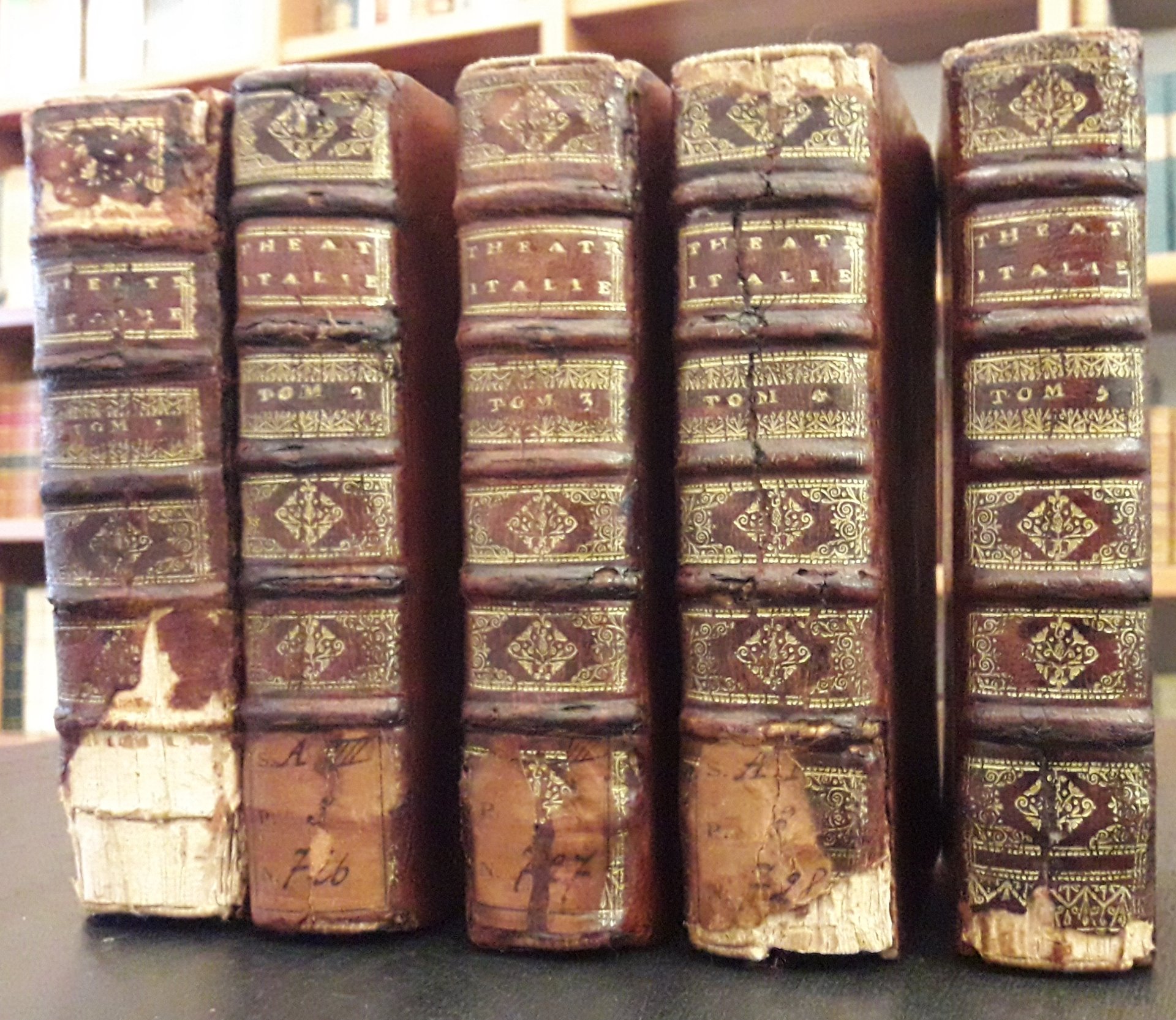 Edizione definitiva e prima ed. illustrata. I primi 5 volumi su 6. In 12°, p. (32)648; (4)552; (4)614; (4)592; (4)549b. 5 antiporte e 46 tavole all'inizio di ogni opera. Numerose pagine di spartiti musicali. Edizione importante. Per la prima volta compaiono i costumi di Arlecchino e degli altri protagonisti della Commedia dell'Arte. Non stampato il primo frontespizio, compare solo il retro. Alcune pagine leggermente brunite. Legatura coeva in pelle. Nervature e fregi in oro al dorso. Mancanze alle cuffie e al dorso di due volumi. (Rasi, p. 383-4; Graesse, III, 76)