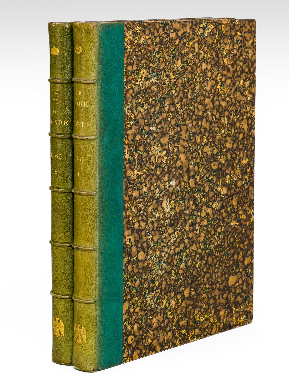 2 vol. in-4 reliure de l'époque demi-chagrin maroquiné vert, dos à 5 nerfs avec couronne et aigle impériales, toutes tranches marbrées, Librairie de L. Hachette et Cie, Paris, 1861, 424 et 426 pp. contient notamment : 1er Semestre : Souvenir d'un voyage au Liban, par E A Spoll - Voyages et Expéditions au Sénégal et dans les contrées voisines - Promenades dans la Tripolitaine par le baron de Krafft (1860) - Souvenirs d'un Squatter français en Australie par H. de Castella (1854-1859) - Voyage à la Nouvelle-Calédonie par Victor de Rochas - Excursion agricole dans le nord de l'Anatolie par Dauzats - Voyage dans les Etats scandinaves - Un hiver à Saint-Pétersbourg par Blanchard - Journal d'un voyage au détroit de Magellan et dans les canaux latéraux de la côte occidentale de la Patagonie par de Rochas - Voyages dans l'Amérique septentrionale par L. Delville - Voyage dans les Provinces du Nord du Portugal par Olivier Merson - De Paris à Bucharest, causeries géographiques par V. Duruy - Voyage dans le Fouta-Djalon - Voyage dans la Cilicie et dans les Montagnes du Taurus par Victor Langlois - 2e Semestre : Voyage au Brésil par Biard - Voyage en Mésopotamie par Flandin - Naufrage et scènes d'anthropophagie à l'île Rossel, dans l'archipel de la Louisiade (Mélanésie) - Fragments d'un voyage au Paraguay par Demersay - Voyage de Tiflis à Stavropol par le défilé du Darial - Voyage dans l'Etat de Chihuahua par Rondé - Voyage dans le pays des Beni-Mezab (Algérie) par Duveyrier - Trois ans de captivité chez les Patagons par Guinnard - Méched, la ville sainte et son territoire - Voyages d'Ida Pfeiffer, relations posthumes - Voyage au Brésil, par Biard Belle reliure peu commune. Bon état (dos lég. passés, qq. rouss., bon exemplaire par ailleurs)