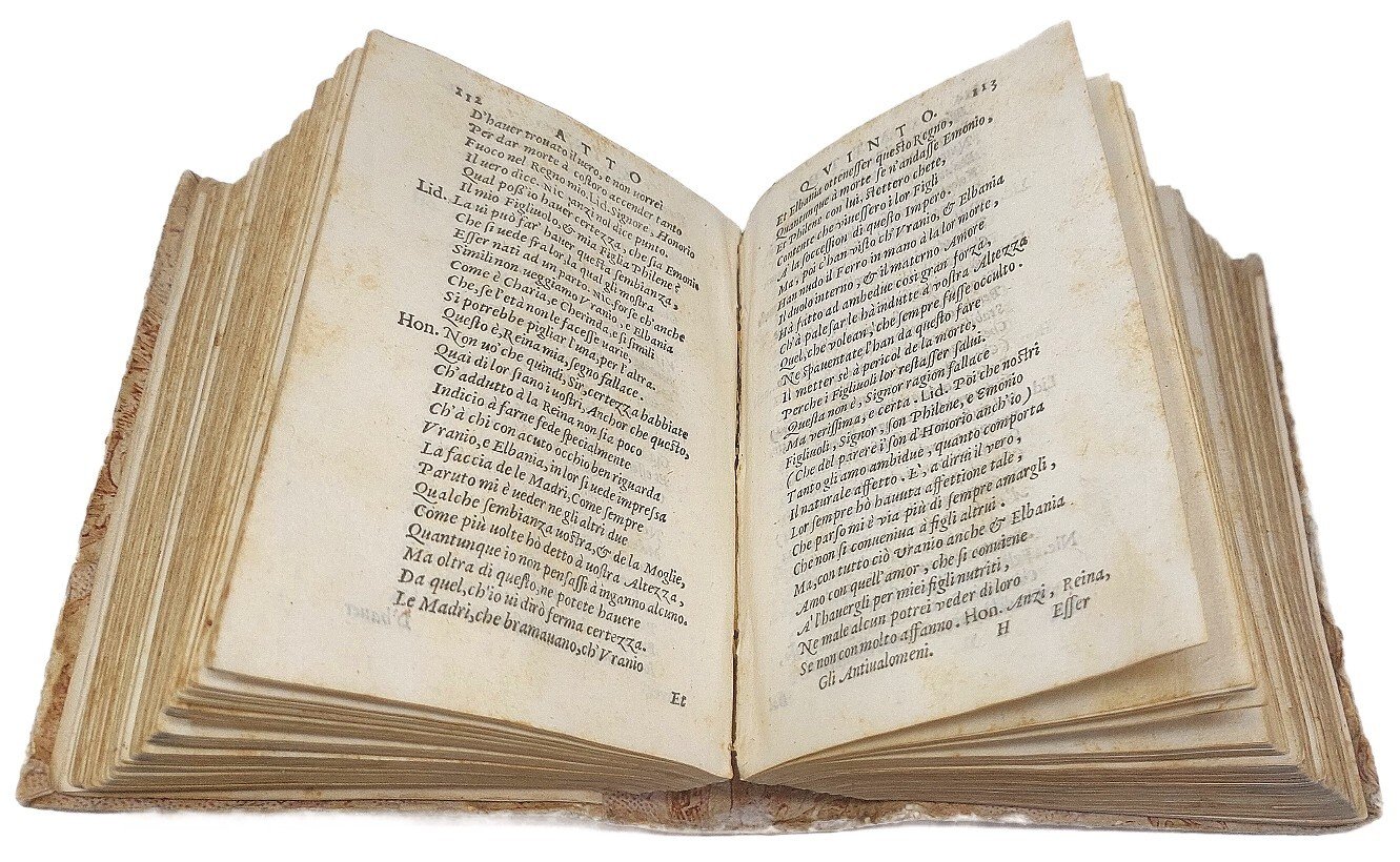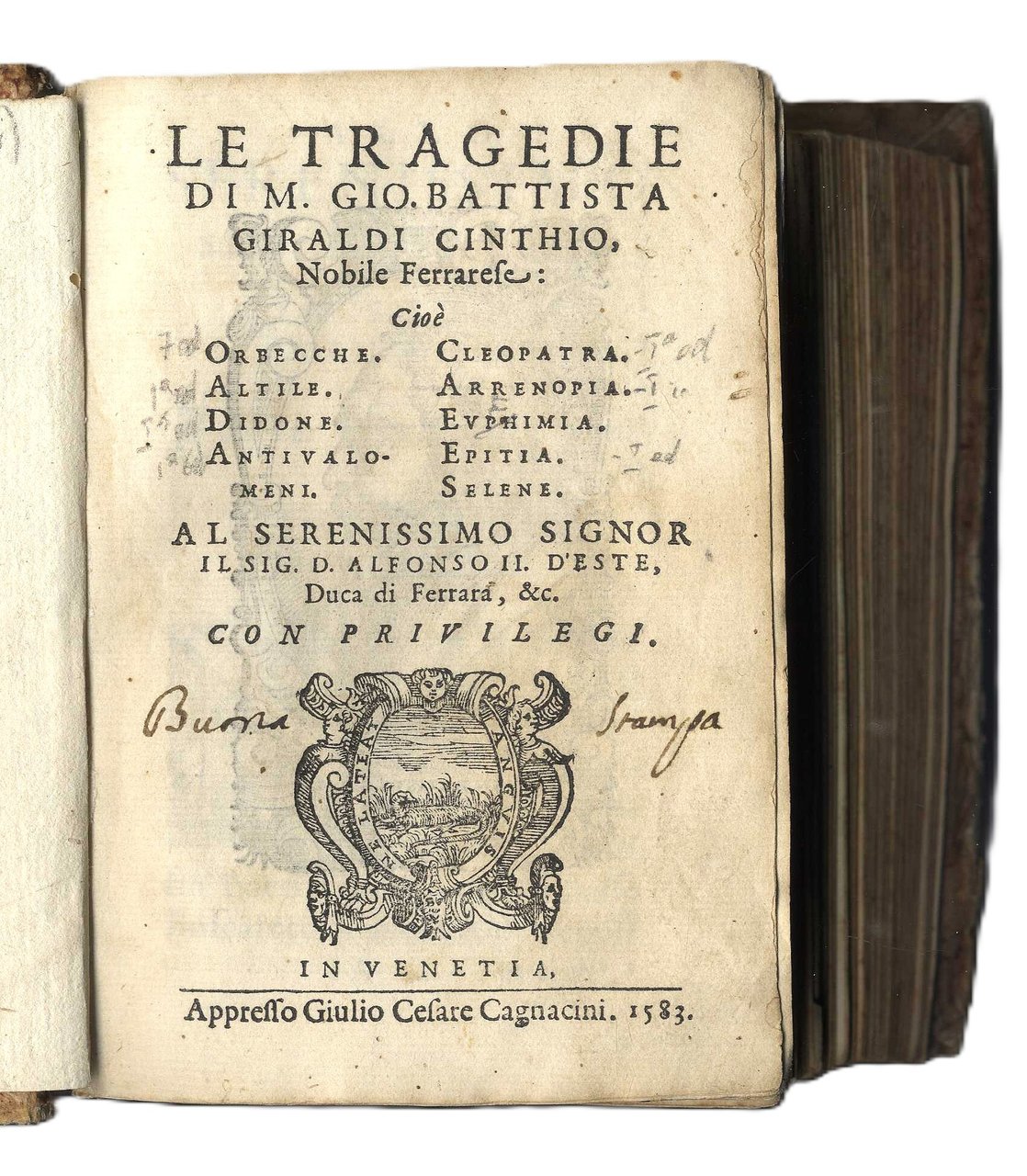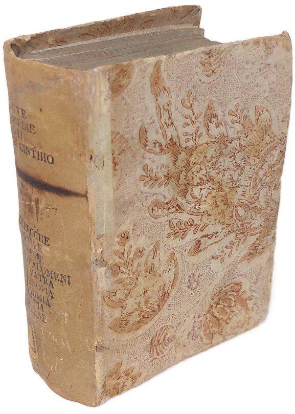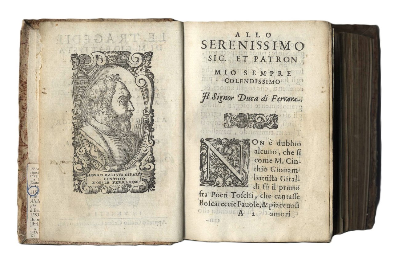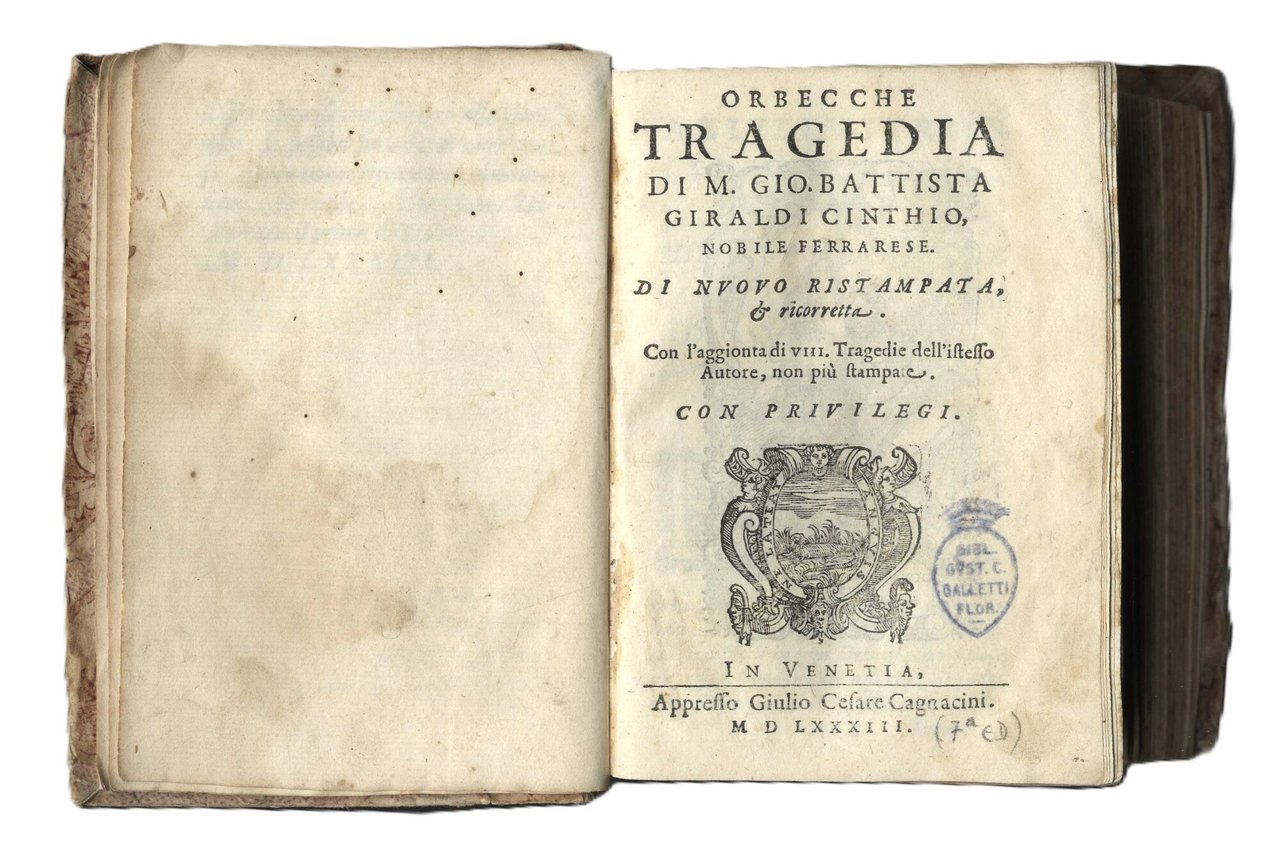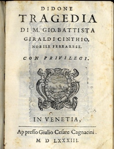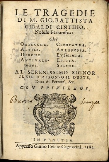 >in-8 (145x100 mm), pp. (16, compreso titolo complessivo della raccolta, con al verso ritratto dell'autore, dedica al Duca di Ferrara, avviso dell'editore al lettore e un f. bianco), seguono le 9 tragedie del Giraldi, annunciate al primo frontespizio, ciascuna con proprio frontespizio, propria numerazione e quasi sempre colophon. Al verso di ogni frontespizio è ripetuto il ritratto dell'a. Legatura 700esca in carta decorata, al dorso stampato nome dell' a. e titoli delle Tragedie (un po' sciupata ma attraente). Comprende: 1) "Orbecche": pp. 135, (1); in fine: In Venezia, Zanfretti 1583; 2) "Altile": pp. 144; 3) "La Didone": pp. 157, (1), 1 f. bianco; la tragedia è seguita da una lunga lettera dell'a. in difesa di questo scritto; 4) "Gli Antivalomeni": pp. 118, 1 f. con impresa e colophon: In Venezia, Moretti, 1583; 5) "Cleopatra": pp. 127, (1); 6) "Arrenopia": pp. 142, 1 f. bianco in fine; 7) "Euphimia", pp. 135, (1); 8) "Epitia", pp. 118 (i.e. 108), 1 f. con impresa e colophon: In Venetia, Moretti, 1583; 9) "Selena": pp. 150, 1 f. bianco in fine. Prima edizione collettiva delle tragedie del Giraldi, che godettero di notevole stima e fortuna, basti pensare, ad esempio, che l'"Epitia" fornì la trama alla tragedia di Shakespeare "Misura per misura". Esemplare complessivamente buono, lievi usuali arrossature; ex libris Landau e timbro Galletti al frontespizio delle Orchecche, antica nota di possesso ms. al titolo: "Buon esemplare". Gamba 1435. Allacci 577, 36, 251, 96, 199, 115, 313, 708. Graesse III, 87. Savioli 144, 320, 347, 786. Olschki, Choix, 21457.