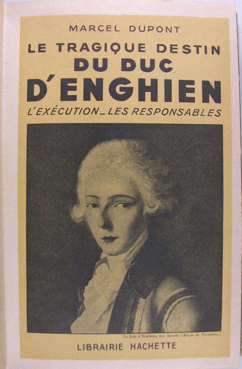 Librairie Hachette, 1947, in/8, reliure en demi-chagrin, 253 pages. "Louis-Antoine-Henri de Bourbon-Condé, connu dans l'histoire sous son titre de duc d'Enghien, né le 2 août 1772 à Chantilly et mort fusillé le 21 mars 1804 à Vincennes, est un prince du sang français. Il est le 10ᵉ et dernier duc d'Enghien, et l'ultime descendant de la maison de Condé."
