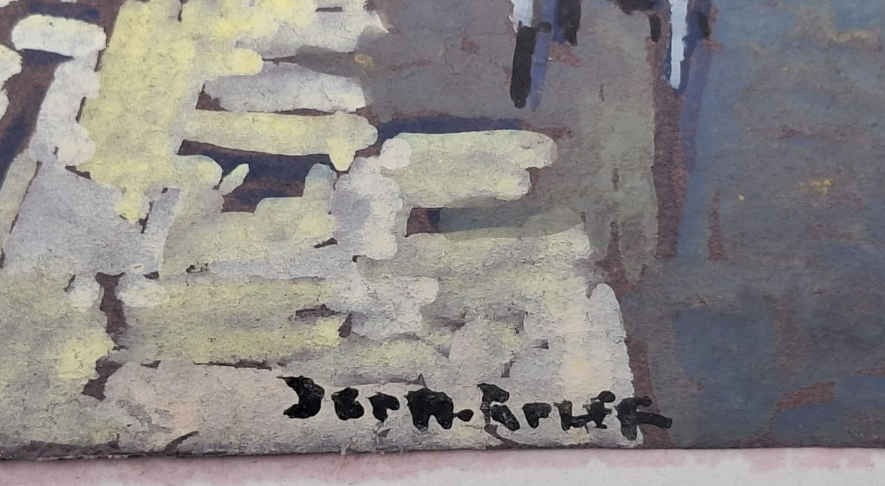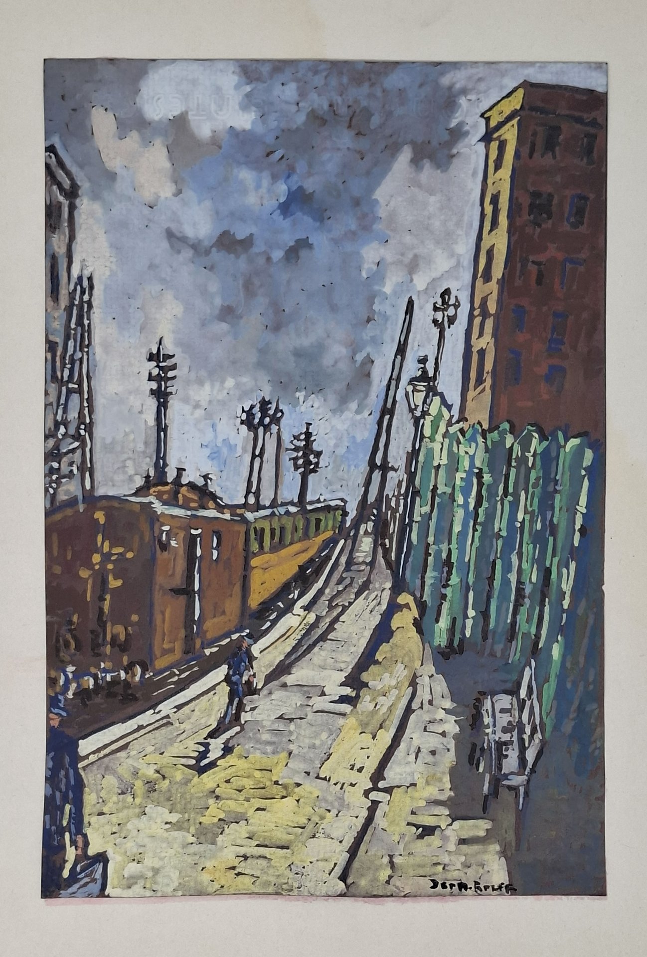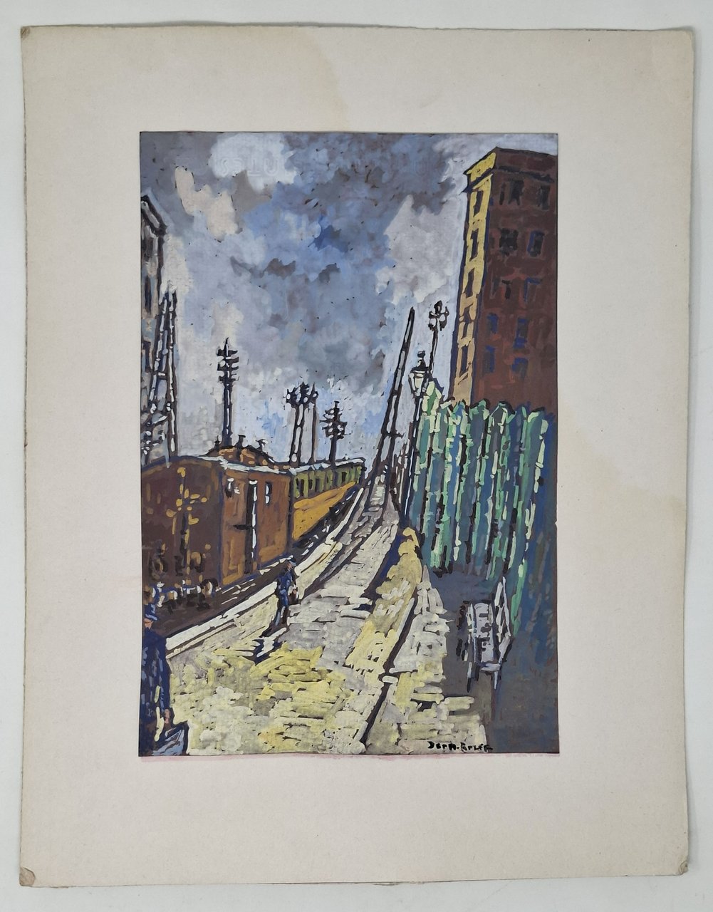Dipinto, applicato su cartoncino, realizzato con tecnica mista, firmato in basso a destra 'Jean - Roger' e titolato, a matita sul retro del supporto, 'Le train de Nullepart'. Jean Roger è stato un artista francese, nato nel 1924 e morto nel 2015. Le sue opere sono state più volte vendute in asta. Dimensioni del dipinto: 17 x 25 cm circa. Dimensioni del cartoncino utilizzato come supporto: 27 x 34 cm circa. Stato di conservazione: dipinto decisamente ben conservato. Qualche piega e un leggero alone (presumibilmente causato da una pregressa umidità) che non intacca il dipinto, sul cartoncino. Paesaggio (con un treno in stazione in primo piano) realizzato con la tecnica molto personale di Roger.