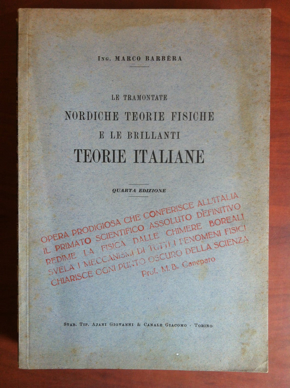 LE TRAMONTATE NORDICHE TEORIE FISICHE E LE BRILLANTI TEORIE ITALIANEIng. Marco Barbera Quarta edizioneStab. Tip. Ajani Giovanni & Canale Giacomo Torino 194484 pagine - formato 16,5x24 cmex libris Avvocato Michele Andreisin buone condizioni salvo brunitura copertina (145 g) E14032