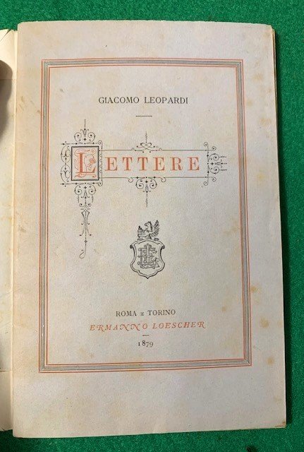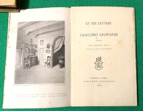 In 8° piccolo; 64, (4) pp., 1 c. di tav. in antiporta in numerazione. Brossura editoriale con titolo in rosso e nero al piatto anteriore, entro cornice in rosso e nero, protetta da velina. Prima ed unica rara edizione di quest'opera che raccoglie tre lettere di Leopardi nelle quali il grande poeta recanatese si dilunga sull'adente desiderio di uscire da Recanati per entrare nei circoli culturali italiani. L'opera presenta una lunga prefazione del noto biografo e filologo marchigiano, Giuseppe Piergili (Cingoli, 15 settembre 1843 Roma, 30 ottobre 1935). Esemplare in buone-ottime condizioni di conservazione.