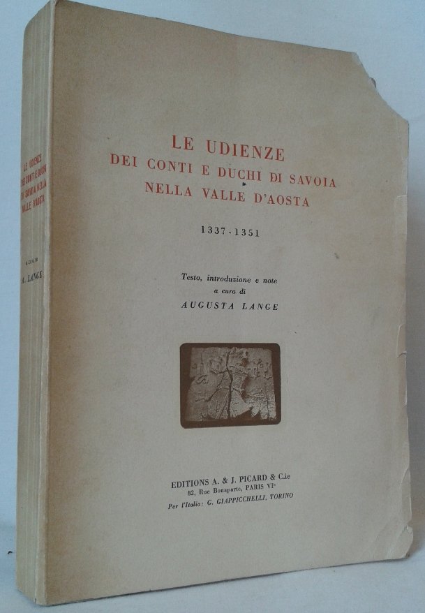 Volume in 8, brossura editoriale in cartoncino, sguardie, frontespizio, indice, 333 pp. Testo che riassume i vari tipi di udienze dei duchi e conti di Savoia nella Valle d'Aosta nel XIV secolo. La copia reca la firma con dedica dell'autrice. In ottimo stato.