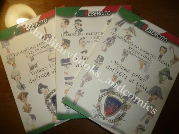 TITOLO: LE UNIFORMI DELL'ESERCITO ITALIANO NEI FIGURINI DI PIETRO GIANNATTASIO 3 Volumi AUTORE: PIETRO GIANNATTASIO DESCRIZIONE: Scuola Sottufficiali dell'Esercito 2005 3 voll. in br. ill. contenenti le tavole uniformologiche del Generale GIANNATTASIO in 4°. L'opera si sviluppa in un arco temporale che va dal 1671 al 1960. Primo volume 1671-1864 36 tavole. Secondo volume 1865-1905 39 tavole. Terzo volume 1908-1960 38 tavole. L'opera racchiude tutte le tavv. di Giannattasio stampate negli anni70/80 ed uscite in sigole monografie. Il Generale C.A. Pietro Giannattasio - autore della splendida collezione di "figurini" che presentiamo - fu, fra l'altro, Ufficiale di Cavalleria e Deputato al Parlamento nella XIII legislatura. Come Ufficiale di Cavalleria, spinto anche dal profondo amore per la sua Arma, agevolato da innata sensibilità artistica, si dilettò e certamente si divertì molto a dipingere delle gustosissime tavole (acquarelli) raffiguranti le uniformi militari attraverso i tempi. Detto così, potrebbe sembrare solo uno sterile hobby, se questa sua attività non fosse stata preceduta, accompagnata e seguita da una ricerca sull'uniformologia e sulla storia dei reparti le cui uniformi venivano via via rappresentate, con minuziosa attenzione in ogni dettaglio. E poi la raffinatezza del tratto, nel riprodurre i volti e le figure degli Ufficiali e una sottile ironia, da non confondere con la caricatura. "Non manichini o figurini più o meno sofisticati, quindi, questi del Tenente Colonnello Giannattasio, ma immagini di uomini visti e presentati con uno schietto realismo armoniosamente accoppiato ad un'acuta, intima analisi". Così si espresse, nel presentare la pubblicazione, Alessandro Gasparinetti, Segretario Generale del Centro Internazionale di Uniformologia. CONDIZIONI: Perfette allo stato di nuovo. PESO/WEIGHT: 1846 gr without package
