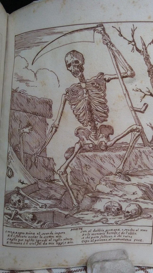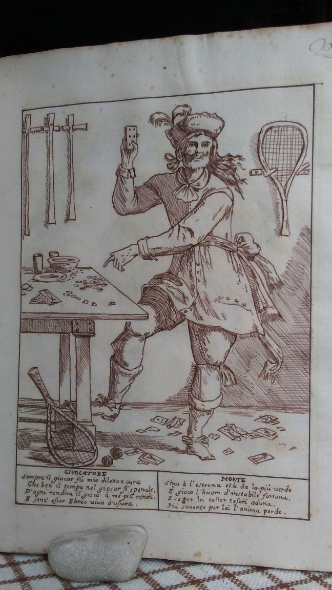 Fascicolo in 4 legato in pergamena floscia, sguardie, due carte bianche, 24 carte con le raffigurazioni delle Ventiquattrhore, dallopera del Mitelli, eseguite a pennino in china. Carta del XVIII secolo, di 20,5 x 28 cm, inquadratura del disegno di 16 x 22 cm. Questa raccolta di 24 disegni a china, riproduce una fra le pi brillanti serie di disegni del Mitelli, in cui mette in scena varie categorie professionali e sociali, specchio del suo secolo, in atteggiamento emblematico. Ad aprire e chiudere la serie le due tavole con la rappresentazione del Tempo (allegoria in cui un vecchio alato, con ai piedi rovine architettoniche, addita un orologio con la mano destra tesa verso lalto mentre con la mano sinistra, in basso, regge una falce) e della Morte che, con il loro monito sulla vanit dellesistenza terrena, gettano unombra moraleggiante su tutti gli episodi figurati; seguono le altre figure: Donna superba, Avaro, Zerbino, Iracondo, Goloso, Donna invidiosa, Pigro et Otioso, Giuocatore, Buffone di Corte, Villano, Musico e Suonatore, Pittore e Scultore, Poeta, Avvocato (Cortigiano), Ingegniero e Aritmetico, Medico, Cacciatore, Astrologo, Guerriero, Dottore versato in tutte le Scienze, R, Morte (che chiude lopera). Al piede di ciascuna scena sono inoltre inserite due quartine, attribuite al fratello dellartista, Giovanni Mitelli, che articolano una sorta di dialogo tra i vari personaggi e la Morte come metafora della durata effimera della vita. Per eccesso di prudenza si data il manufatto alla seconda met dell'ottocento. I disegni sono di ottima fattura, qualche fioritura della carta in alcune tavole. In bello stato. Esemplare unico, affascinante e prezioso.