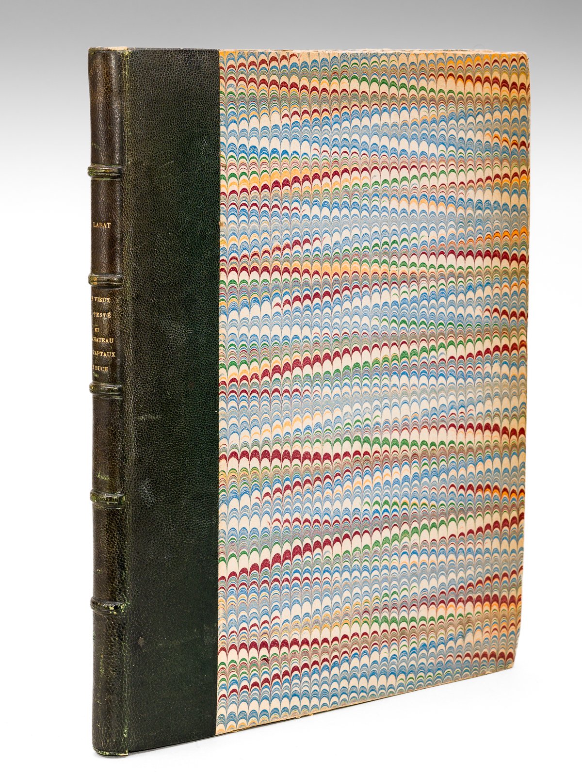 Exemplaire de l'auteur numéroté "0" sur papier de hollande, signé par l'auteur, 1 vol. in-4 reliure de l'époque demi-chagrin vert, dos à 5 nerfs, Féret et Fils, Bordeaux, Libraires Associés, Paris, 1900, 1f., XIII-96 pp., 3 ff. n. ch. avec 6 planches hors texte (dont armoiries en chromolithographie), 2 ff. (affiche publicitaire pour l'ouvrage) et 1 f. (bulletin de souscription), 1 note manuscrite de l'auteur (copie d'un extrait de l'Histoire de France d'Henri Martin), et 2 comptes-rendus de l'ouvrage (coupures de presse) Remarquable exemplaire de l'auteur, numéroté "0" et signé par celui-ci, sur beau papier de hollande. L'ouvrage fut inspiré à l'auteur par la découverte chez Jules Delpit d'une aquarelle représentant le château des Captaux de Buch. Gustave Labat commence son bel ouvrage par le récit d'un magnifique souvenir de jeunesse "Un voyage à Gujan-Mestras en 1835" mené par l'auteur aux côté de son ami Jacques-Emile Brives-Cazes sur les charettes de retour de Sage-Grandjeay, l'un des grands poissonniers de Gujan. Il fallait alors 15 heures pour rejoindre le bassin d'Arcachon depuis Bordeaux. Le château des Captaux de Buch se situait près de l'église Saint Vincent, et Gustave Labat se rappelle en avoir pu encore constater en 1848 les vallonnements laissés par les anciens fossés. Le titre de captal de Buch désignait les seigneurs régnant du Moyen-Age à la Révolution sur le territoire des paroisses de La Teste, Gujan et Cazaux (aujourd'hui communes de La Teste de Buch, Gujan Mestras et Arcachon). Bon exemplaire (un document rajouté postérieurement en fin d'ouvrage a été enlevé, la couverture d'une notice du docteur Lalesque sur Nicolas Brémontier est collé en garde, sans le texte, très bon état par ailleurs, ex-libris Gustave Labat).
