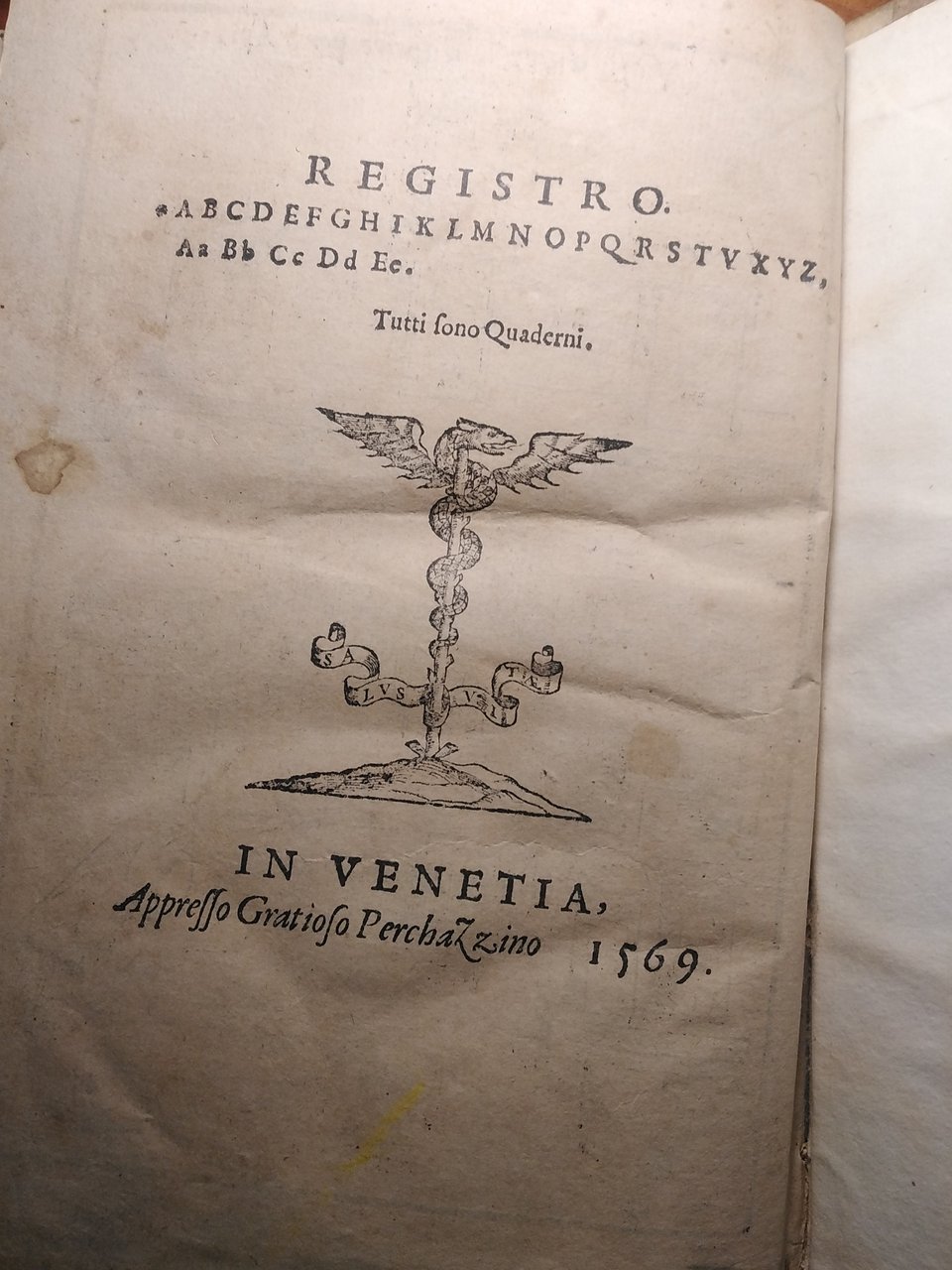 In Venetia, appresso Grazioso Percaccino, 1569; seconda edizione (la prima del 1550 conta 10 giornate). Legatura ottocentesca in mz pelle con piatti marmorizzati; in 8°, cm 15 x 21,5; pp. ( 24 ) n.n. comprensive di frontespizio, ritratto in antiporta e tavola delle cose più notabili + 448 comprese tavole delle figure e colophon. Frontespizio figurato a piena pagina, al retro ritratto dell'autore. Testatine, capilettera, e ben 19 tavole di incisioni raffiguranti gli strumenti da lavoro. Edizione riccamente illustrata, altre edizioni presentano un numero di tavole ben inferiore. Eccellente conservazione, pagine pulite. Unico piccolo difetto un forellino cha va dal frontespizio alle prime 6 carte. SOLO SPEDIZIONE NAZIONALE. CHIEDERE DISPONIBILITA'