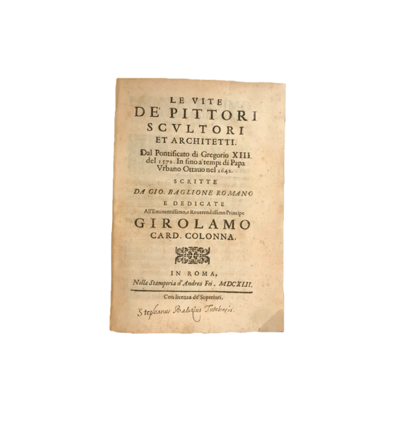 "PRIMA RARA EDIZIONE CON AUTOGRAFO DI ETIENNE BALUZE AL FRONTESPIZIO. AUTOGRAFATA "STEPHANUS BALUZIUS TUTELENSIS", In-4, pp. (14), 405, (3), senza il ritratto e l'antiporta, come documentato in numerosissime altre copie, anche celebri, come la copia Macclesfield. Può dunque considerarsi completo. Piccolo fregio xilografico al frontespizio, capilettera decorati, testatine e finalini. Legatura inglese settecentesca in piena pelle con cornici a doppio filetto dorato sui piatti, fregi dorati sul labbro. Legatura restaurata, con qualche abrasione e mancanza ai morsi e alle cuffie. Baglioni fu il primo storiografo del barocco a Roma. Una discreta copia, internamente pulita ed in ordine, con importante provenienza: la famosa biblioteca, contenente almeno 12mila titoli, dello storico francese Etienne Baluze (1630-1714), bibliotecario di Colbert. Si veda il catalogo della vendita all'asta della sua Bibliotheca Baluziana (Parigi, 1719, p. 443), in cui il titolo appare come lotto n 5618; il volume poi passato in Inghilterra ("Roehampton" annotato al recto della carta di guardia disopra), poi appartenuto a Leo Olschky (Ex libris con numero di catalogazione sul risguardo del piatto anteriore) ed infine entrato nella biblioteca dell'antiquario milanese Sandro Orsi (numero di catalogazione in matita al contropiatto). Graesse, I, 275: "C'est une continuation de l'ouvrage de Vasari"; Cicognara 2190; Fossati Bellani 1412; Schlosser Magnino, p. 460; Grassi II, pp. 37 Ð 38; Rossetti 672."