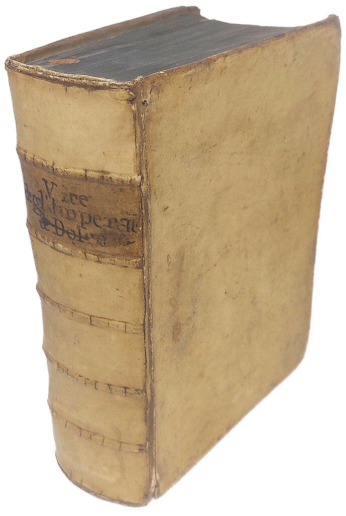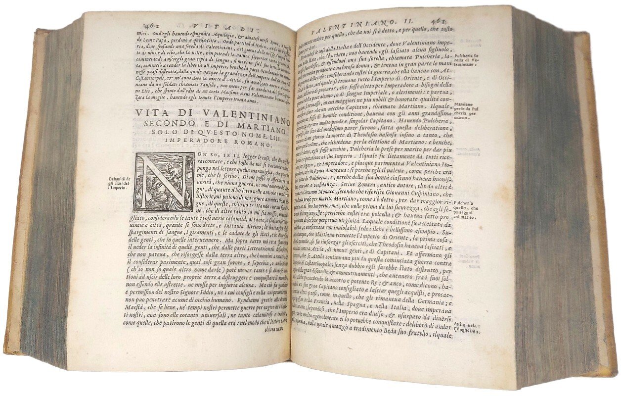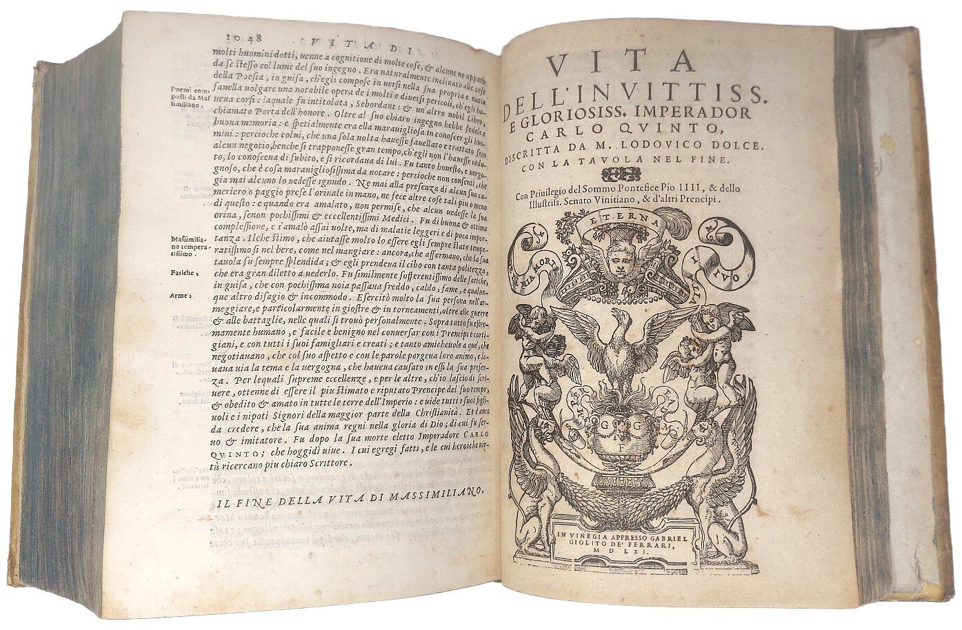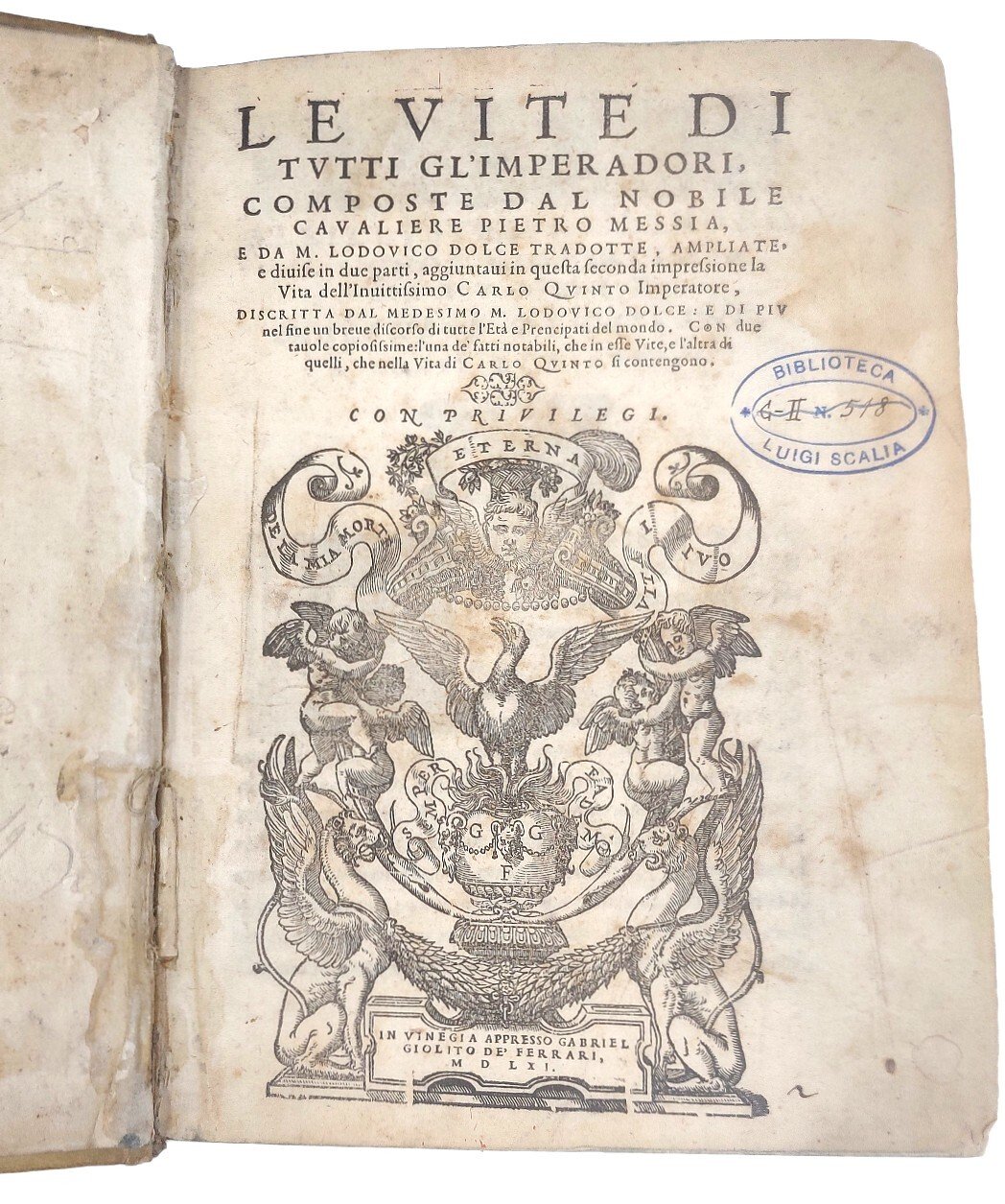 >2 opere in un vol. in-4, pp. (68), 1048; (12), 96, (16); legatura coeva p. pergamena, tit. ms. al dorso, tagli azzurri. Grande impresa tipogr. su entrambi i frontesp., altra più piccola in fine, testatine ed iniz. xilogr. animate. Dedica del Dolce a G.B. Castaldo. Seconda edizione (la prima apparve presso lo stesso Giolito nel 1558) della traduzione del Dolce di questa celebre opera dello spagnolo Mexia sulla storia di tutti gli imperatori da Giulio Cesare fino a Carlo V, la cui vita "è richiamata nel frontespizio, e deve esservi unita perchè l'esemplare sia completo" (Bongi). L'autore, italianizzato in Messia, scrisse varie opere in lingua spagnola, subito tradotte in italiano, tra le quali fu sovente ristampata e divenne celebre per le curiosità in essa contenute la "Selva di varia lettione". Esempl. assai ben conservato (lievi estese arrossature, timbro di biblioteca estinta nel margine del tit.). Manca all'Adams. Bongi II, pp. 136-7. BMC 436.