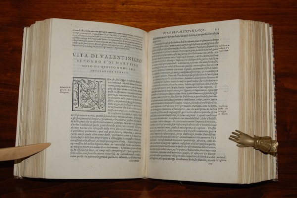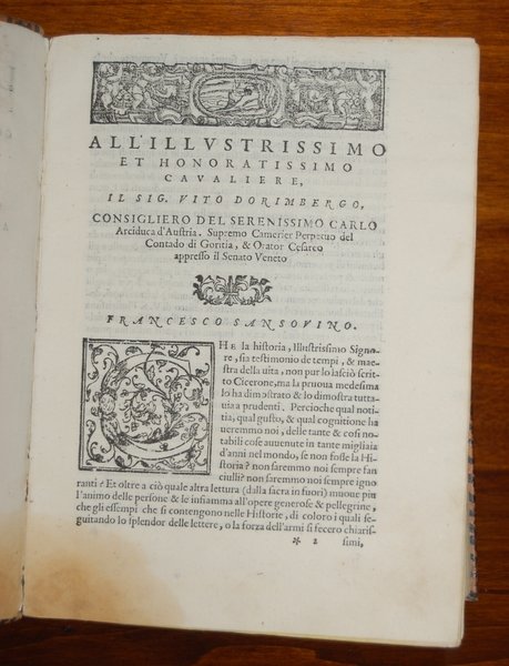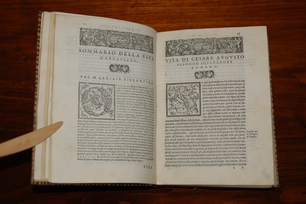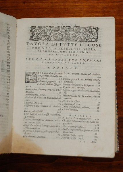 [Figurato] (cm.21) bella legatura in pieno vitello maculato del XVII sec. Ricchi fregi in oro al dorso, titolo entro tassello, specchi con rosone floreale, labbro interno decorato a dentella.-- cc. 32 nn., cc. 531 + 1 c. bianca, dedica a Vito Dorimbergo. Apparsa nel 1558, questa nostra edizione Ë assolutamente particolare. Ricchi fregi e centinaia di grandi capolettera figurati e decorati raffinatissimi la caratterizzano e la distinguono per la sua grande bellezza tipografica ed eleganza. Manca a tutta la bibliografia da noi consultata compreso Palau al quale rimandiamo per confronti con le molte edizioni e opere di questo famoso e facondo autore. un lievissimo alone a scomparire all' angolo bianco interno di alcune carte all' inizio, peraltro esemplare assolutamente magnifico, puro e nitido, stampato su carta grave di ottima qualit‡. Una sola copia in Adams M 1387.[f72]