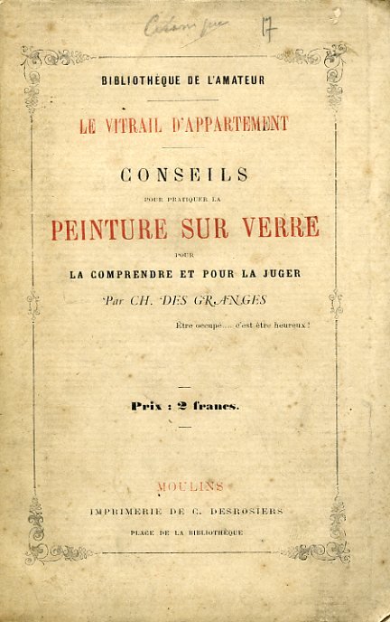 In-16°, pp. (4), 80, brossura editoriale con titolo in rosso e in nero entro filetto con fregi accantonati. 6 tavv. f.t. in fine su 4 fogli. Minimi restauri al dorso e minime fioriture, ma bell'esemplare. Prima edizione di questo bel manuale sulla tecnica della pittura su vetro. Bibliothèque de l'amateur.