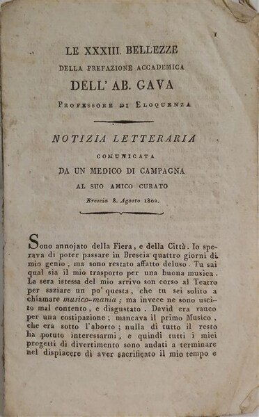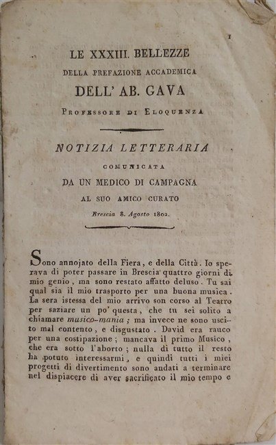 LE XXXIII BELLEZZE della prefazione accademica dell'Ab. Gava professore di eloquenza. Notizia letteraria comunicata da un medico di campagna al suo amico curato. Brescia 8 Agosto 1802.