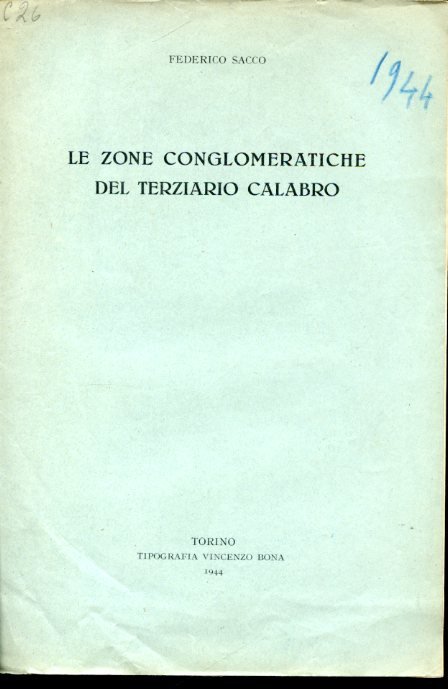 In-8°, pp.11, brossura editoriale verde acqua. Una figura n.t. Ottimo stato. Estratto dagli 'Atti dell'Accademia delle Scienze di Torino', vol. 79, 1943-'44. Nota prsentata nell'adunanza del 23 febbraio 1944. Nel contributo il Sacco illustra le intercalazioni conglomeratiche esistenti tra i terreni terziari marini della calabria, deducendone le pulsioni orogenetiche che fecero emergere tale regione in momenti successivi.