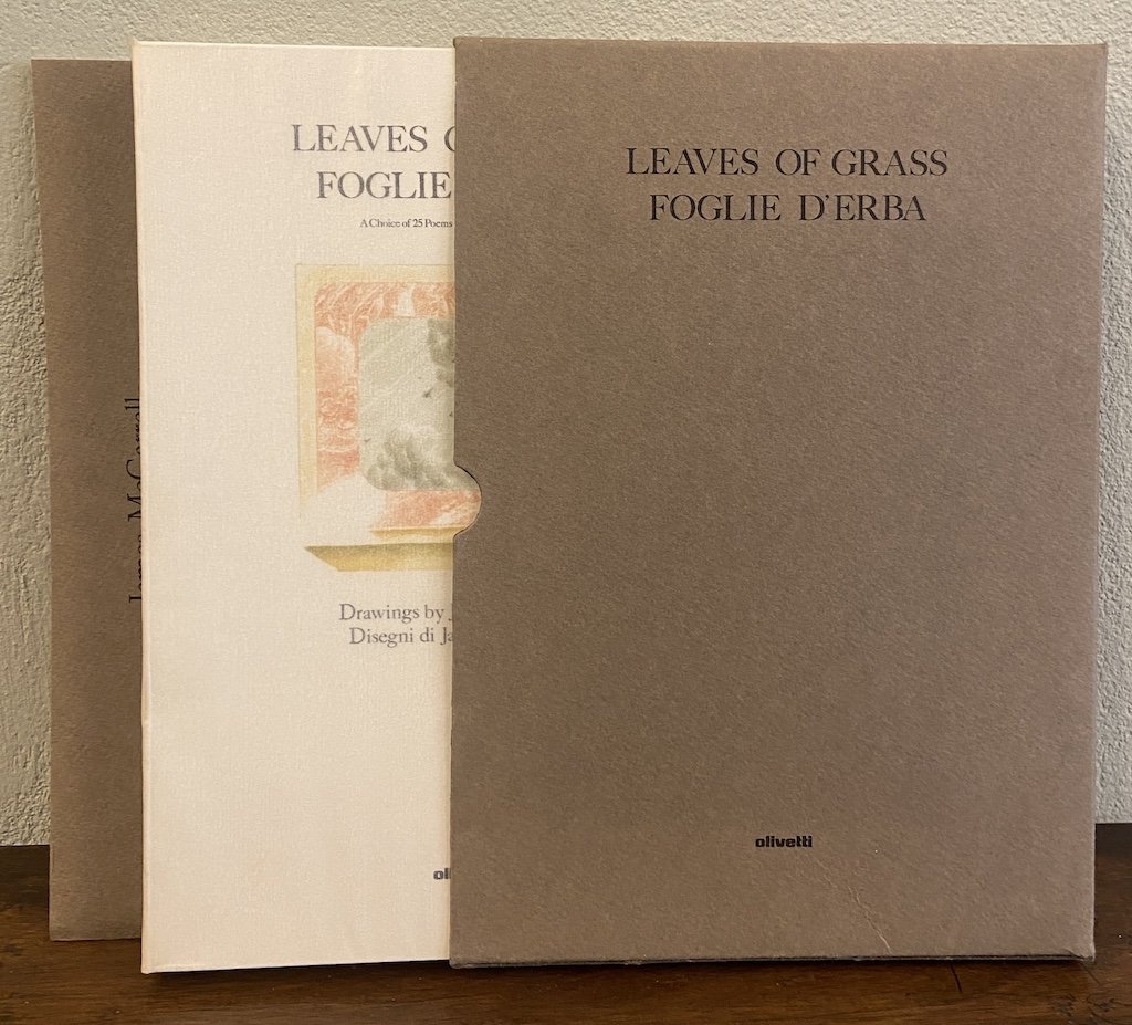 Legatura editoriale in brossura con sovraccoperta ripiegata a busta e velina protettiva, cm 24x17, pp 151 (3), alcune illustrazioni a colori riproducenti disegni di James McGarrell. Selezione di poesie di Whitman a cura di Giorgio Soavi, basata sull’edizione Einaudi con traduzione di Enzo Giachino, rivista per questa occasione. In custodia in cartoncino a stampa, accompagnato da fascicolo in brossura cm 24x17 di pp (32) intitolato James McGarrell, Here the Frailest Leaves of Me - Qui le più fragili mie foglie, con dodici disegni riprodotti a colori a piena pagina.