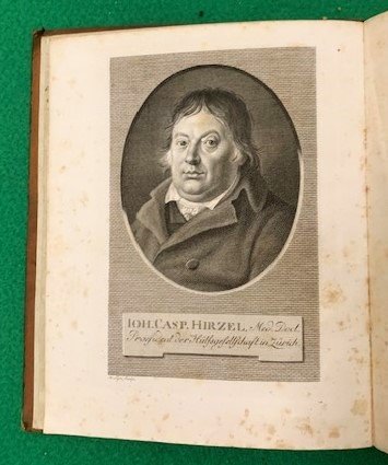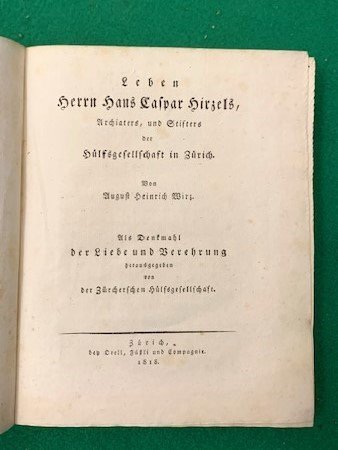 In 4°; XLIII, (1), 222, (2 b.) pp. e una c. di tav. con ritratto di Hirzels disegnato da H. Lips. Lunga nota manoscritta coeva di due pagine alla prima carta in bella grafia. Legatura in peina cartoncino marmorizzato con titolo ed autore in oro su fascetta rossa al dorso. Qualche strofinatura. All'interno in ottime condizioni di conservazione. Prima edizione di questa importante biografia di Hans Caspar Hirzel (il Secondo) (1751-1817) che fu uno dei medici più famosi ed influenti della Zurigo del XIX° secolo oltre che valente ostetrico. L'opera ripercorre l'attività di Hirzel nella Hülfsgesellschaft zurighese, nonché la fondazione e l'attività della Hülfsgesellschaft. Herzel fu anche un valente scrittore di economia rurale. In particolare, partendo dalla conoscenza di un abile agricoltore svizzero, decise di metter per iscritto le esperienze di quest'ultimo, pubblicando il volume conosciuto come The Rustic Socrates. Opera che ebbe notevole successo e venne poi tradotta in diverse lingue europee. Caspar fu uno dei principali fondatori della Società Elvetica nel 1726 insieme a Isaak Iselin e Salomon Gessner. Herzel fu uno dei principali traduttori in tedesco delle opere di Tissot. Rif. Bibl.: Barth13976.