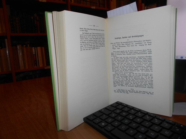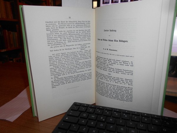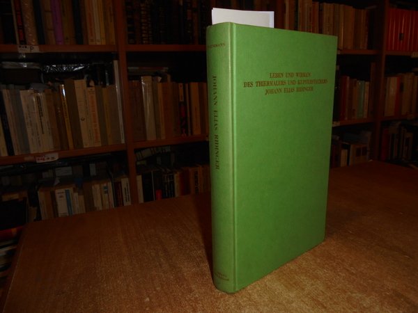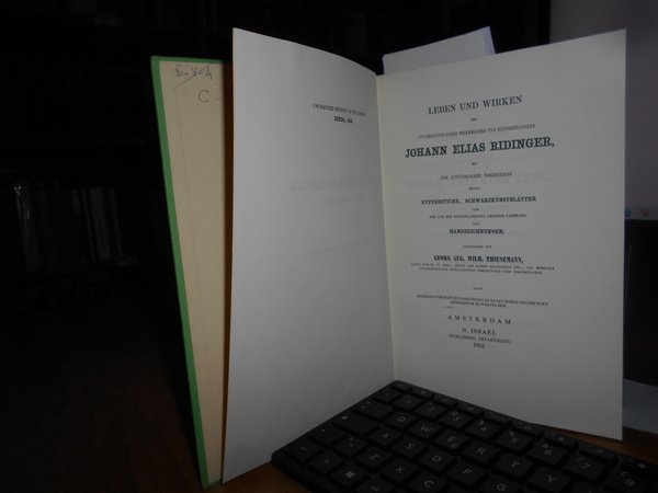 Thienemann, Georg August Wilhelm. Editore: Amsterdam : Israel, 1962. Leben und Wirken des unvergleichlichen Thiermalers und Kupferstechers Johann Elias Ridinger, mit dem ausführlichen Verzeichniss seiner Kupferstiche, Schwarzkunstblätter und der von ihm hinterlassenen grossen Sammlung von Handzeichnungen. geschildert von Georg Aug. Wilh. Thienemann. In-8°, tela verde edit. con titoli in oro al dorso e sul piano. xxxi, 300, 22, 30, (1) pp. Testo in tedesco. Completo e come nuovo. Uff. C - II - 3