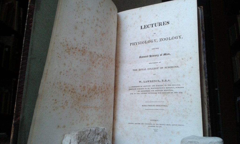 Volume in 8 legato in mezza pelle con unghie, marmorizzato al piatto, titolo in oro al tassello al dorso ornato a cinque nervi, sguardie, bianca, frontespizio, dedicatoria ed indici, XII, 400 pp., 12 tavole in rame f.t. di cui 7 pi volte ripiegate. Con quest' opera sir W. Lawrence (1800 - 1875) poneva le basi della moderna antropologia, fieramente avverso all' intrusione della teologia e della metafisica nell' ambito della scienza si guadagnava solida fama di materialista data l'enfasi posta sull'importanza delle prove empiriche nella ricerca, nomea che doveva portare al ritiro della prima edizione di questo lavoro in cui, tra gli altri concetti, rifiutava la visiona Lamarckiana dell' ereditariet sviluppando teorie assai in anticipo sui suoi tempi. Arricchiscono questo bel volume 5 tavole raffiguranti le principali variet di specie umane e le splendide tavole pieghevoli recanti i disegni comparativi dei teschi dellle stesse. Bruniture diffuse sulla bianca ed al frontespizio, lievi nel testo. In pi che buono stato. Importante e raro a reperirsi completo.