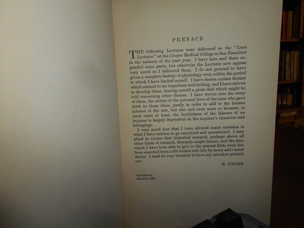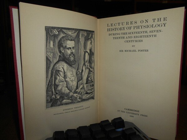 Sir MICHAEL FOSTER. Cambridge, at the University Press, 1924. Lectures on the History of Phisiology during the sixteenth, seventeenth and eighteenth centuries. In-8°, tela rossa con titolo in oro entro tassello al dorso. (v), 306 pp. Ottimo esemplare. Uff. C - IV - 6