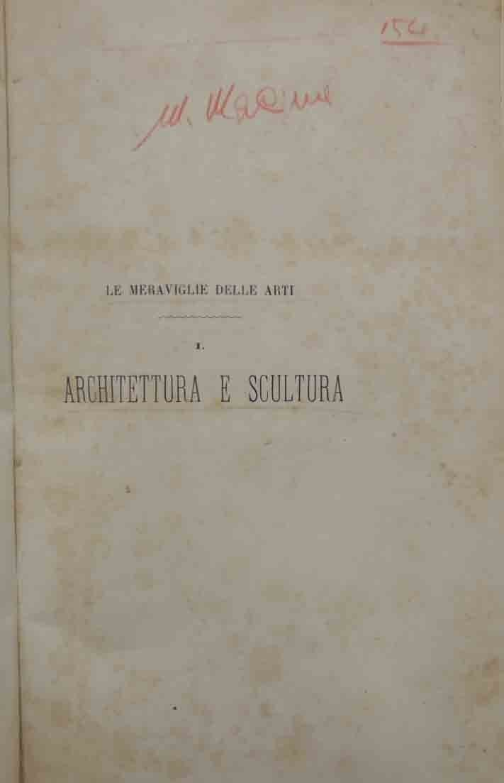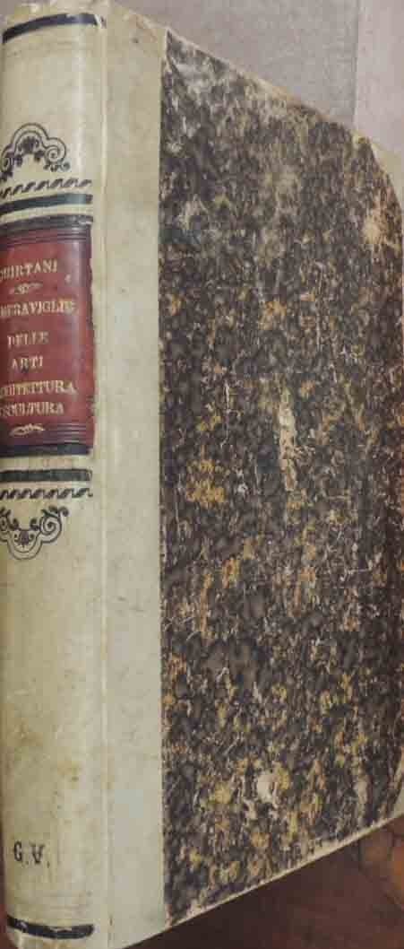 Le meraviglie delle arti, descritte da Andrea Lefèvre e Luigi Viardot, con numerose note ed aggiunte di Luigi Chirtani. Volume primo: Architettura e scultura, Fratelli Treves editori, Milano 1881, nuova ed. italiana illustrata da 313 incisioni, pp. X, 608, ill. b.n., 86 c. di tavv. ill. b.n., cm 28, elegante legatura in mezza pergamena con al dorso titoli entro tassello, fregi e filetti. Firma d’appartenenza e numero progressivo di classificazione all’occhiello. Minime abrasioni ai piatti e al dorso, leggera traccia di gora di limitata estensione al margine superiore di circa metà volume che però non pregiudica minimamente la fruibilità del testo né più di tanto la sua pregevolezza, qualche cerniera con piccoli rinforzi d’epoca in carta, per il resto leggere fioriture e bruniture, ma volume complessivamente in buono stato impreziosito da pregevole legatura.