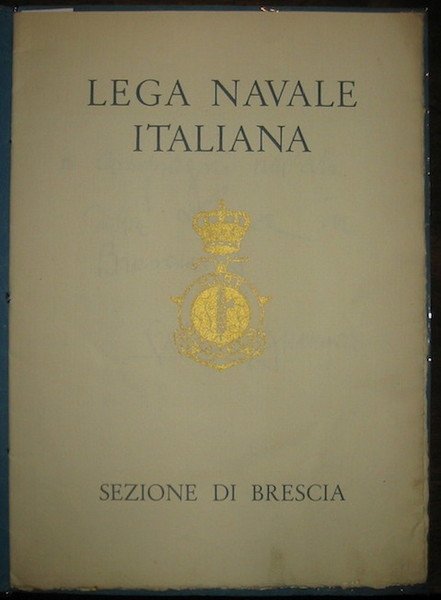 4to (cm. 35), 10 cc.nn. con due foto b.t. (ritratto di G.d.A. e Nave trasportata nel giardino del Vittoriale. Carta a mano in barbe con filigrana ‘Io ho quel che ho donato’. Frontespizio con stampa in grigio e stemma in oro con la scritta ‘Mare nostrum’. Copertina d’origine in cartoncino azzurro con al centro lo stemma di S.Marco in oro. Sul retro lo stemma della ‘Magnifica Comunità del canal di Brenta’. Ottimo esemplare. Guabello, 305; Vecchioni, 86.