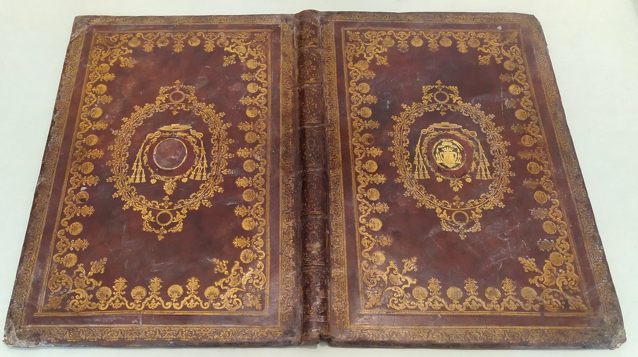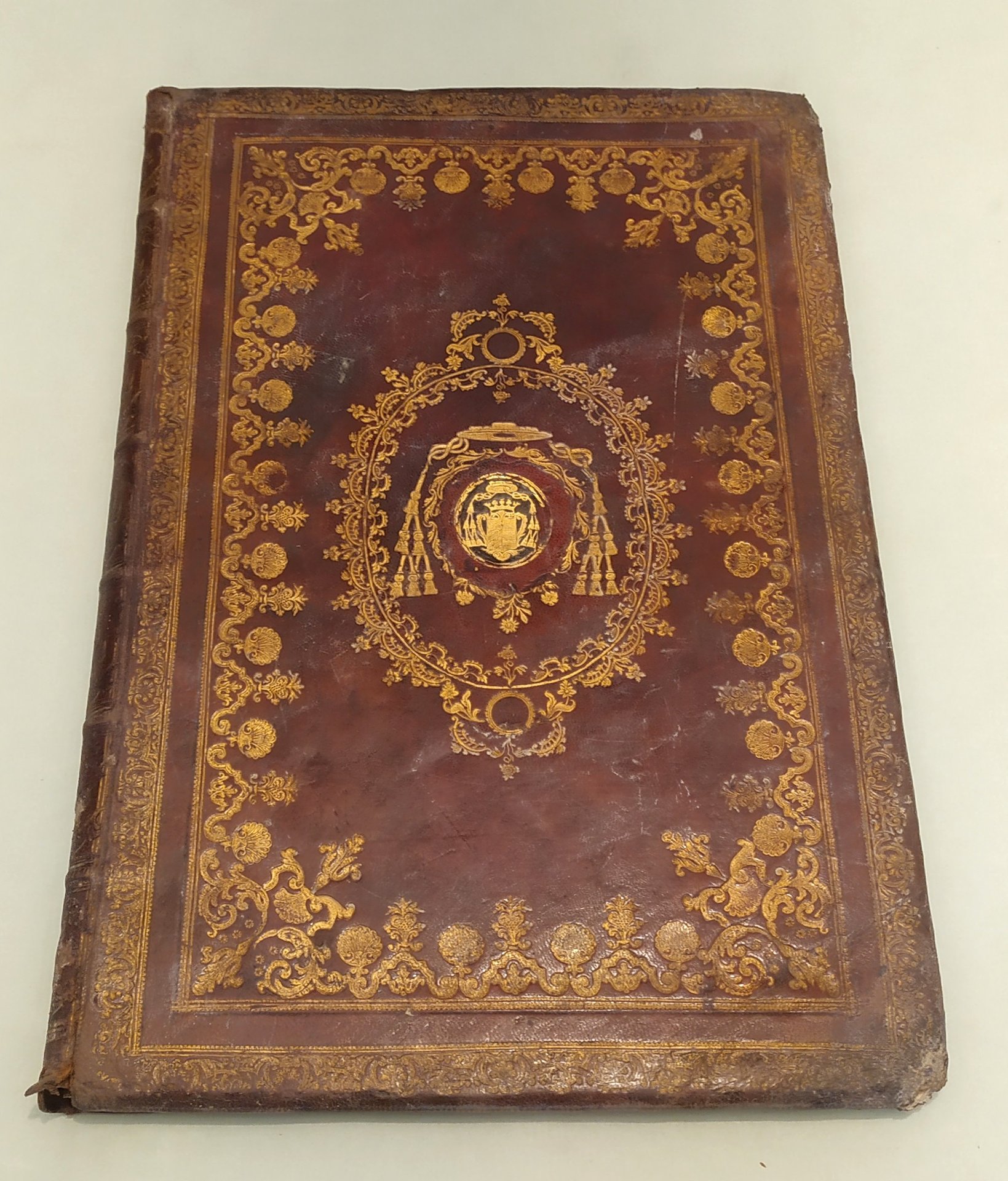 LEGATURA CARDINALIZIA. 1650 circa. In folio. Cm.43x30. Bazzana marrone, stemma cardinalizio ai piatti racchiuso da quadruplice fregio in oro con motivi floreali e marini.
