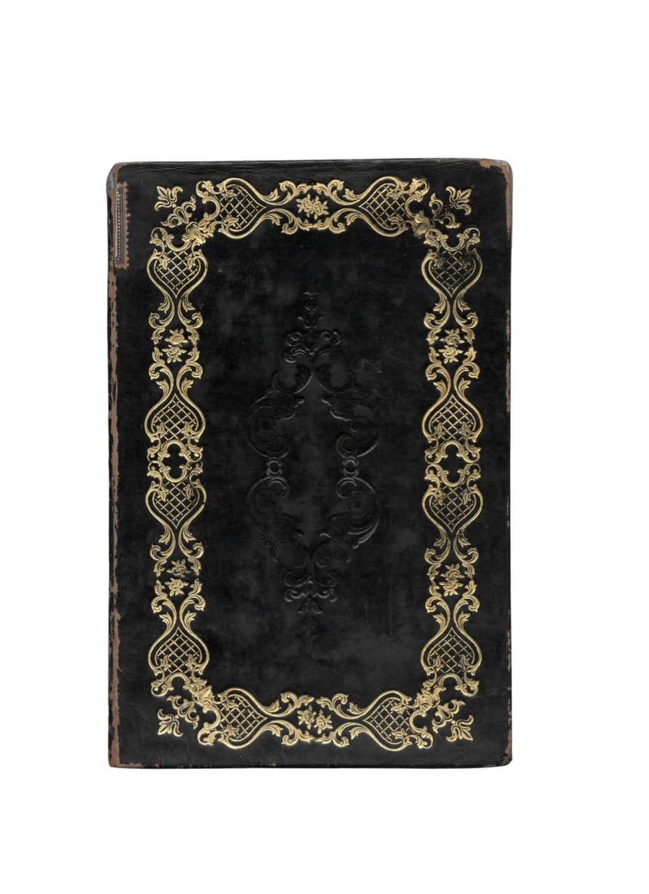 Legatura coeva bresciana dell'Istituto San Barnaba in marocchino nero con ricchi fregi in oro e a secco sui piatti