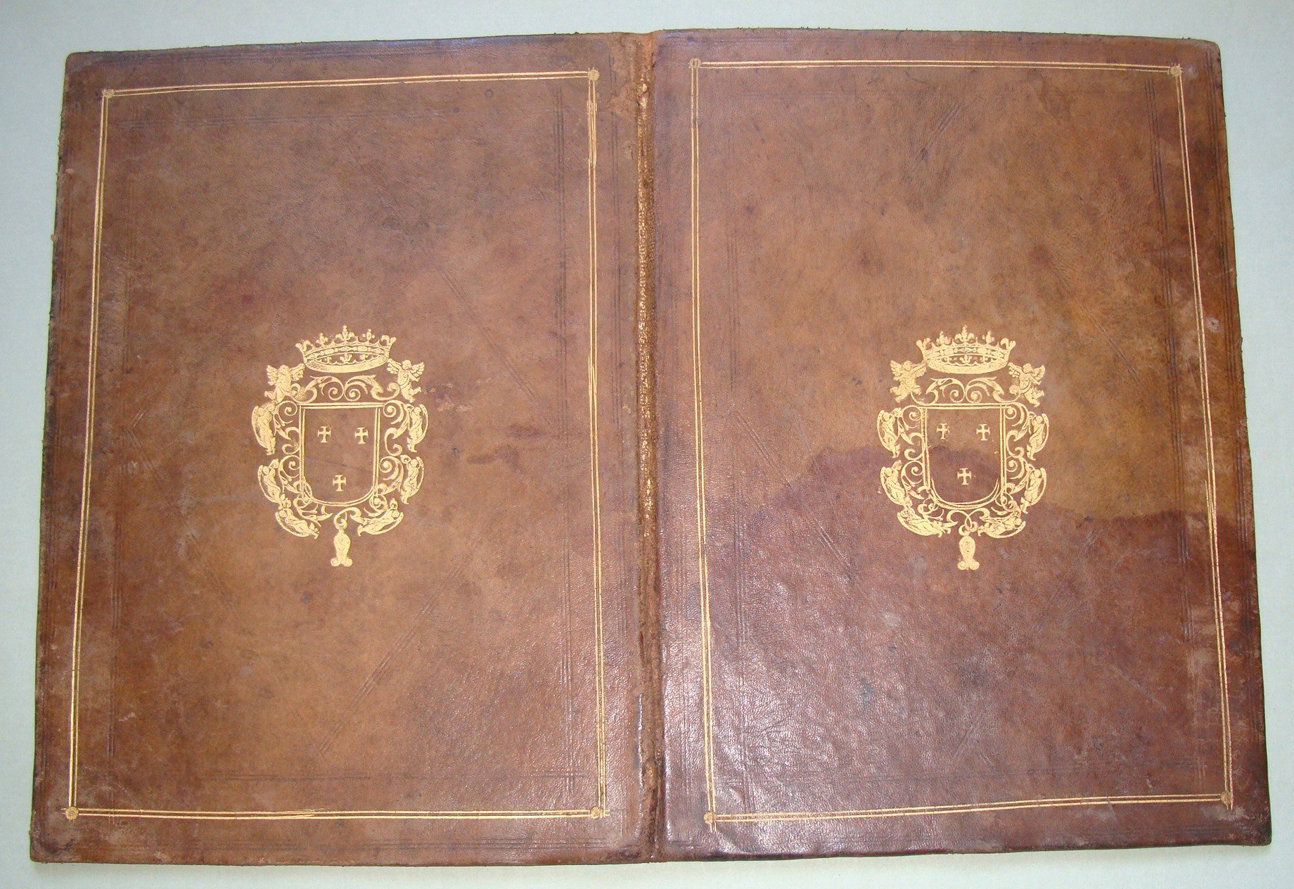 In 4to. Cm.33x23. Fregio in oro inquadra i piatti con al centro stemma araldico. Macchia d’umido al piatto anteriore.
