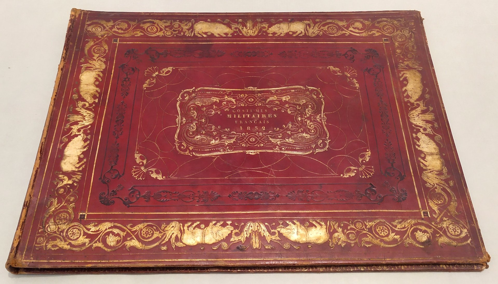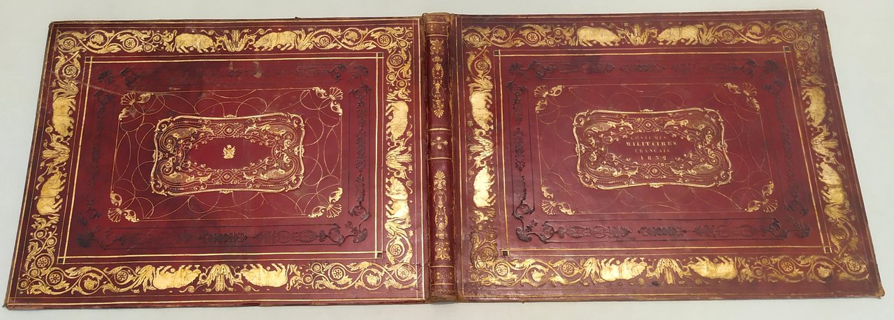 LEGATURA in marocchino rosso. 1832. In 4to oblungo. Cm. 28x35. Fregi a secco ed in oro ai piatti che inquadrano il titolo Costumes militaires Francais. Come bordure un fregio raffigurante animali e fiori. Dentelles.