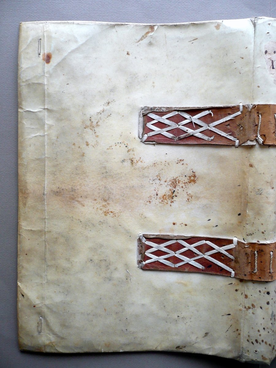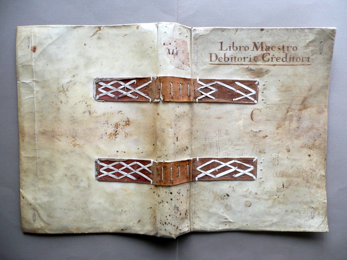 Legatura in pergamena, Libro Maestro Debitori e Creditori - Bella legatura d'epoca in piena pergamena, con dettagli (finiture estetiche) in pelle e cuoio allumato XVIII Secolo circa S. d. (XVIII Secolo circa); bella legatura d'epoca realizzata per volume di grande formato, in piena pergamena, con titolo annotato a mano al piatto ant.; pregevoli dettagli estetici costituiti da due strisce di pelle applicate mediante cordelle e laccetti in cuoio allumato (vedi foto); cuffia sup. con traccia di vecchia etichetta. Piatto ant.con qualche vecchia annotazione d'epoca. Cm 42x33,5. Condizioni di conservazione Coperta complessivamente in buono stato con tracce d'uso e del tempo, alcune piccole irregolarità e leggere ondulazioni; leggeri aloni, tracce di sporco e qualche piccola macchietta (vedi foto). SETT2.L12841 N