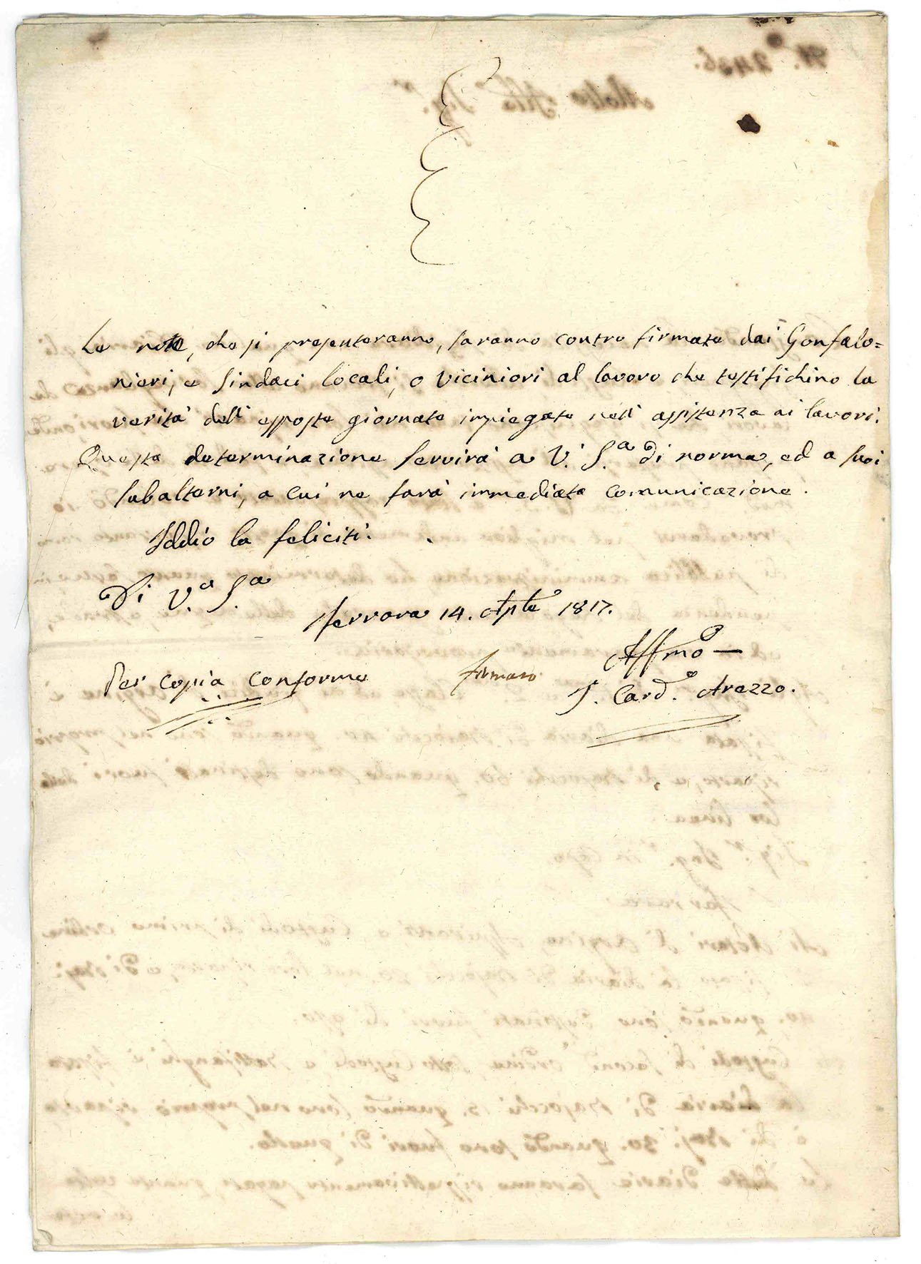 - Bifolio vergato su tutte e quattro le facciate contenente copia di una lettera non firmata ed indirizzata al segretario del Cardinal Legato (lo stesso Arezzo) contro la riduzione degli onorari e delle diarie degli ingegneri d'acque e strade, con riferimento alla lettera del cardinale sopra citata;