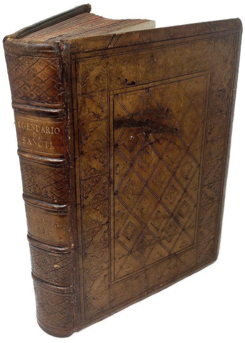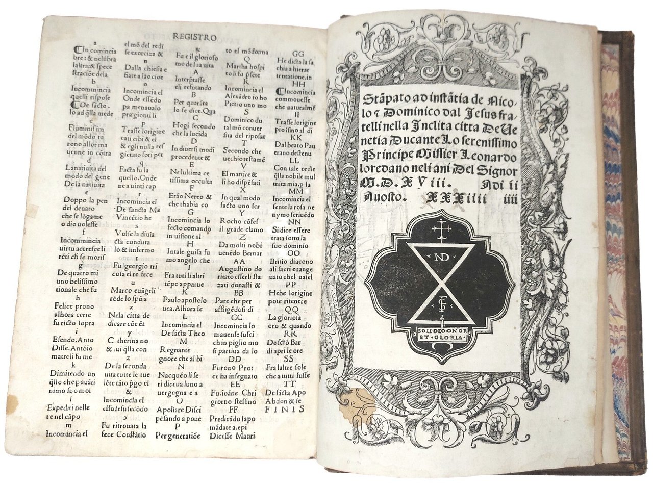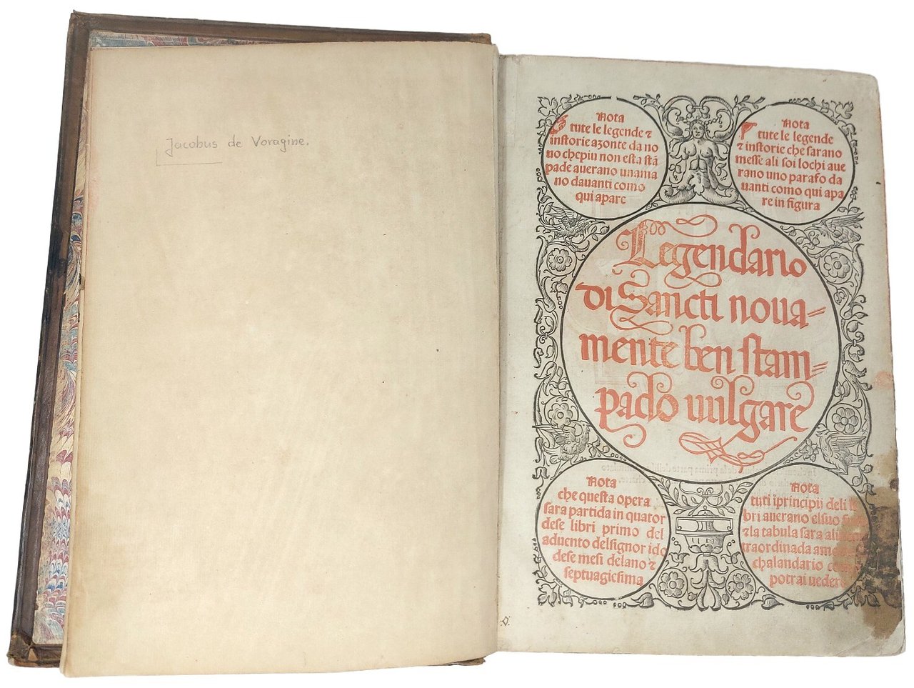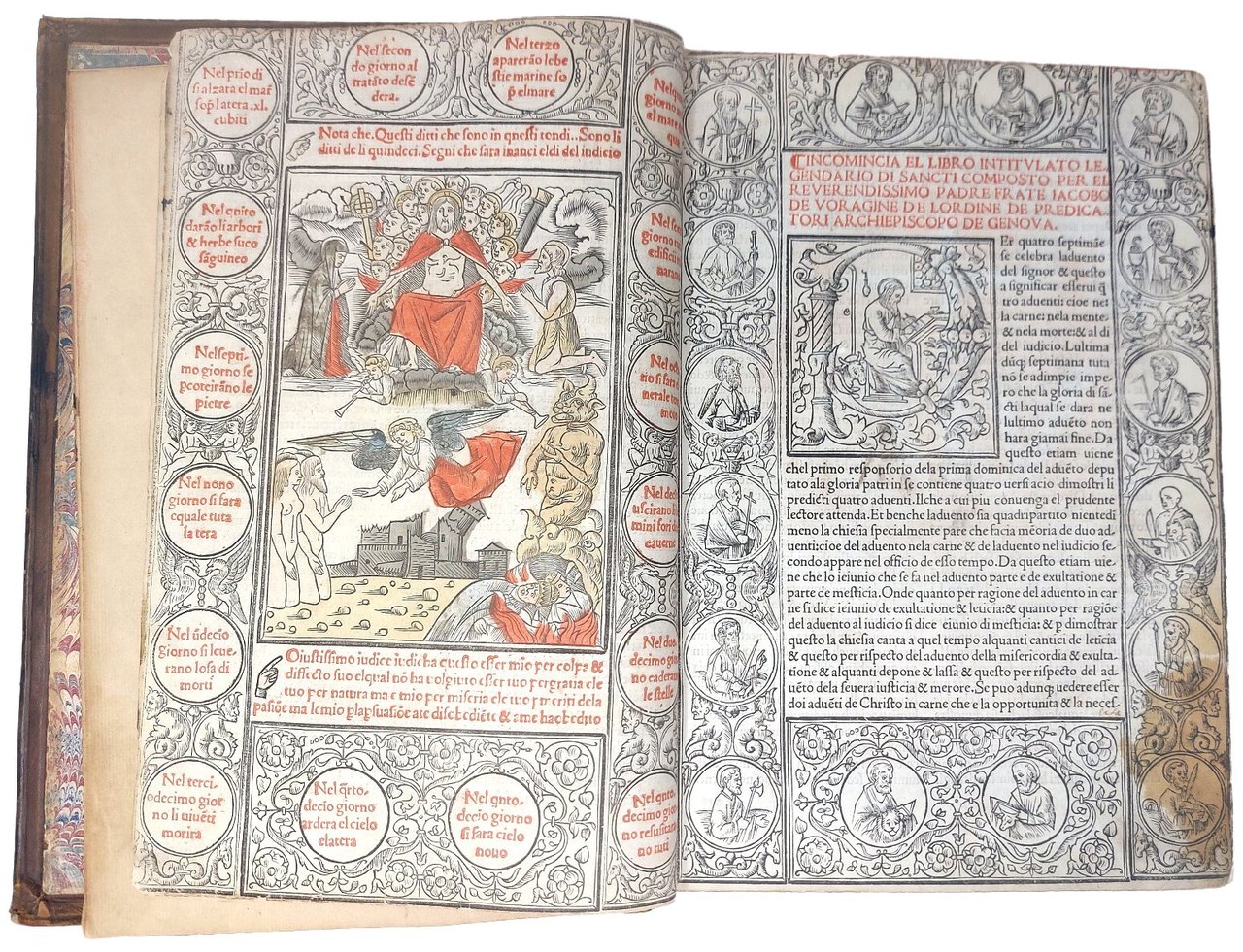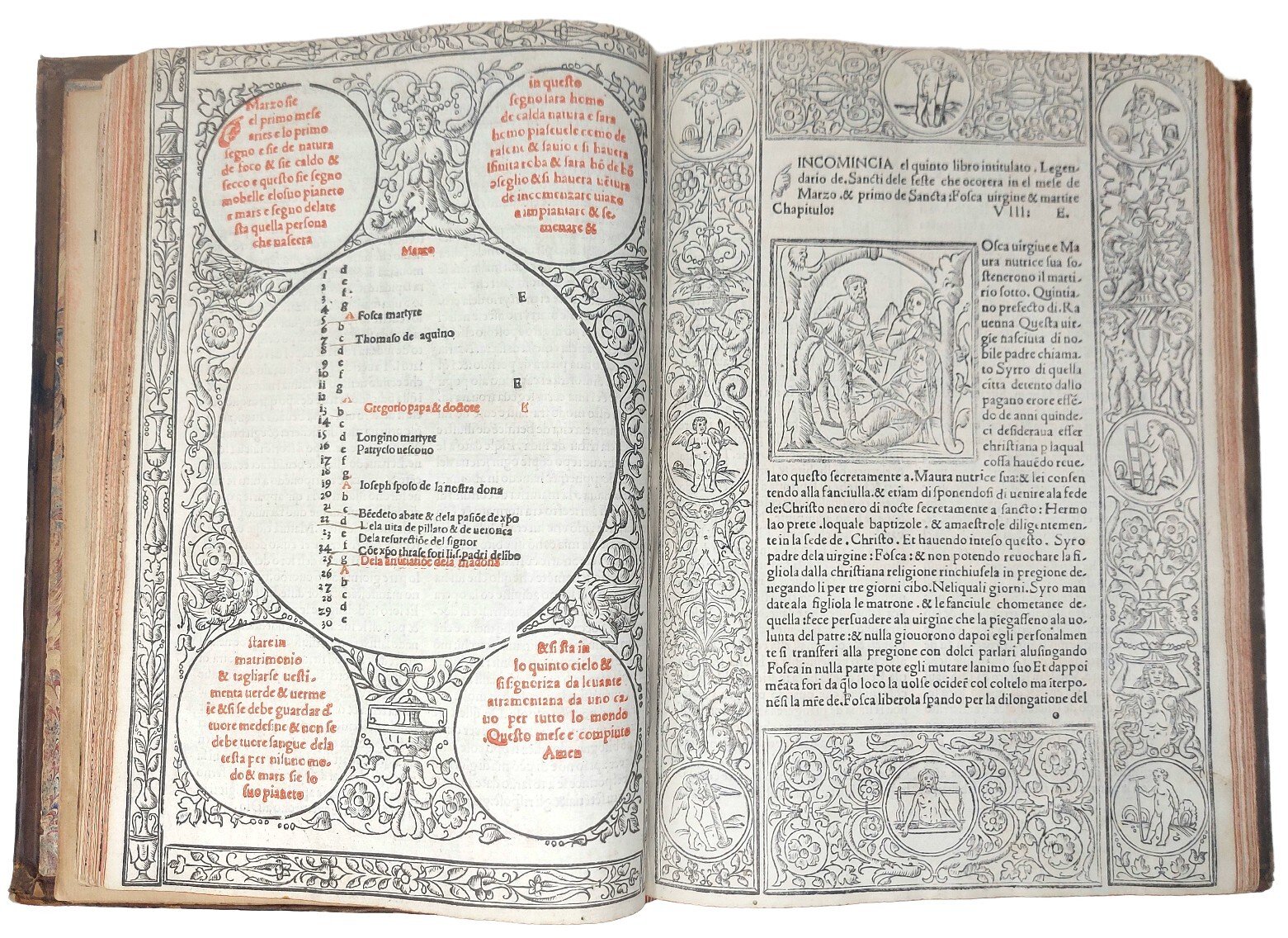 >in-4 (290x195 mm), ff. 344 (segn. 354), (4) Bella leg. ottocentesca ad imitazione antica, elaborata decorazione a secco ai piatti, tit. in oro e fregi a secco al dorso a nervi, tagli goffrati in rosso e oro (difetti alle estremità delle cerniere, qualche abrasione). Testo impresso su due colonne, car. tondo in rosso e nero; titolo in grande car. gotico e istruzioni per la consultazione dell'opera impressi in rosso entro 5 tondi inseriti in bordura a grotteschi; al verso grande ''crisma'' con croce in negativo entro grande arabesco su fondo rosso; colophon in grande car. gotico entro bordura e, al verso, silogr. tonda con 2 angeli che reggono uno scudo vuoto. La stupenda illustrazione del volume comprende inoltre: 15 bordure di 4 legni con ritratti in tondo, e grande capolettera istoriato all'interno; 12 elaborate bordure con vasi e grotteschi, che comprende 5 tondi con calendario di ogni mese e sue peculiarità impressi in rosso; 56 tondi di diametro 15 cm con scene della vita dei Santi e Martiri, inscritti in quadrato con fregi agli ang.; un Giudizio Universale (colorato all'epoca) entro bordura di 4 legni con versi in rosso entro tondi; 5 silogr. di grandi formati diversi (Assunzione e Natività della Vergine, Adorazione dell'Eucarestia, Crocefisso della Scuola di S. Giovanni a Venezia, S. Adriano) e un foglio con 6 legni relativi a S.Apollonia; 124 vignette a larghezza di una colonna, raffig. scene della Bibbia, gran numero di grandi iniziali ornate. Questa edizione, come già quella del 1505, venne diffusa con due frontespizi differenti: in caratteri xilo-tipografici (di cui si conoscono il presente esemplare e altri 2, di cui uno presso la Biblioteca Casanatense di Roma e l'altro alla Fondazione Cini di Venezia; cfr L. Pagnotta, Le edizioni italiane della ''Legenda Aurea'' (1475-1630), Firenze 2005, p. 108) o in caratteri romani tipografici (noto in due esemplari: Biblioteca Apostolica Vaticane e Biblioteca Marciana). Una delle più belle edizioni della raccolta di vite e leggende dei Santi, composta da Jacopo da Varazze (1230-1298) verso il 1266, che conobbe enorme fama, ed ebbe gran numero di edizioni, anche figurate; la presente riprende, nello stile generale e nel tema dei tondi, l'opera attribuita a San Girolamo sempre sulla vita dei Santi (Venetiis, per Otinum da Pauia de la Luna, 1501). L'editore si è curato, oltre che di fornire le istruzioni per la consultazione sul frontesp., di corredare l'opera di un indice alfabetico, del registro e, fatto assai raro, dell'indicazione degli errori e delle omissioni nella numerazione delle carte. Rara e ricercata edizione volgare figurata, fedele ristampa dell'edizione del 1505 degli stessi tipografi; straordinaria per la ricchezza e la peculiarità dell'illustrazione, nella quale il tondo è tema ricorrente. La sua bellezza è confermata da Essling, che dedica ben 22 pag. di descrizione e riproduz. delle figure. Bell'esemplare, ex-libris "Filosofia Ermetica" al contropiatto anteriore (alcune bordure lievem. rifilate su 2 lati, strappo restaurato a un f., antico rinforzo al margine interno del frontespizio, ed un alone nel margine inf. dei primi 8 ff.) Il Cat.Unico censisce un esempl., presso la Casanatense e uno presso la Fondazione Cini di Venezia, così come un esempl. del 1505, presso la B.Mai di Bergamo. Non in BMC né Adams. Sander 7729; Essling 689: ''magnifique volume, un des plus complets et des plus variés qu'il soit possible de voir en fait d'illustration''