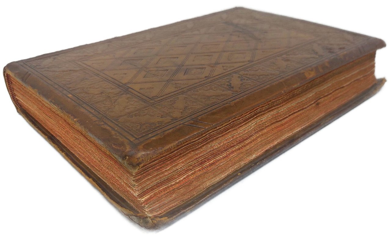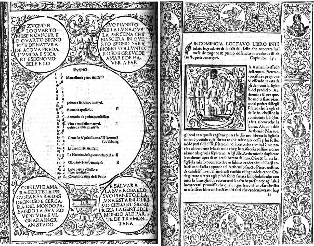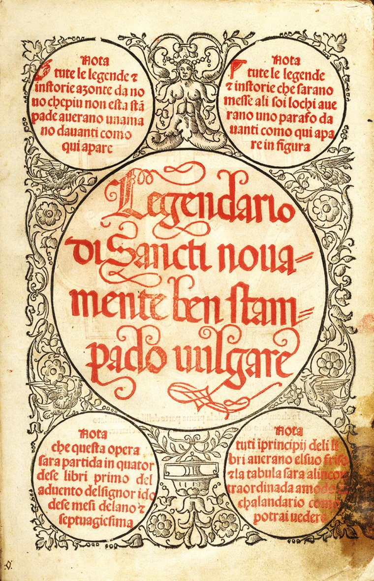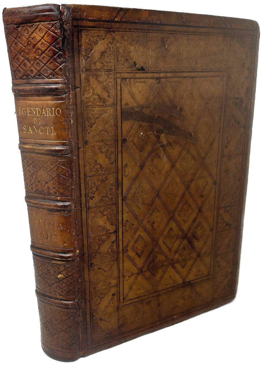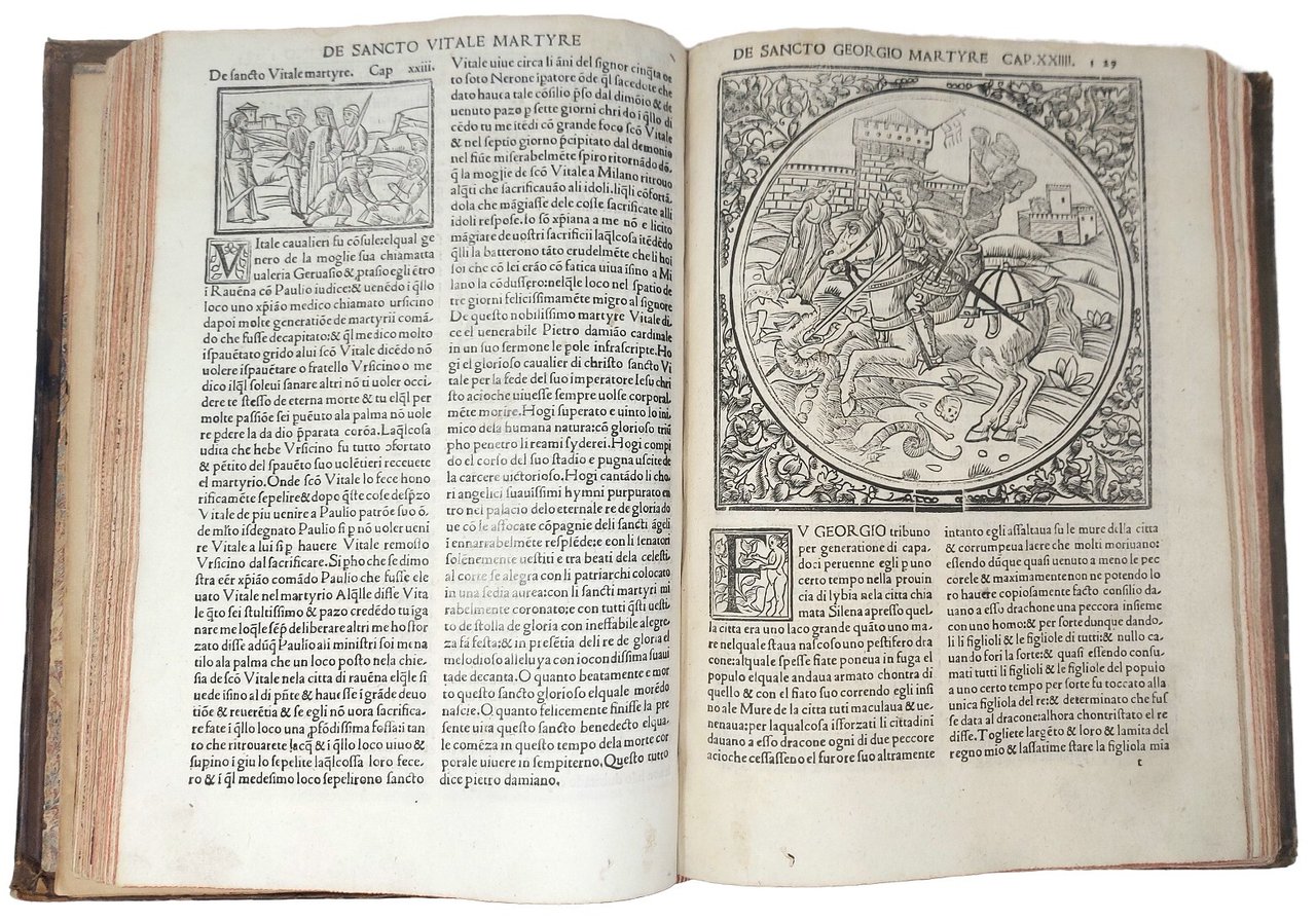 >in-4 (290x195 mm), ff. 344 (segn. 354), (4) Bella leg. ottocentesca ad imitazione antica, elaborata decorazione a secco ai piatti, tit. in oro e fregi a secco al dorso a nervi, tagli goffrati in rosso e oro (difetti alle estremità delle cerniere, qualche abrasione). Testo impresso su due colonne, car. tondo in rosso e nero; titolo in grande car. gotico e istruzioni per la consultazione dell'opera impressi in rosso entro 5 tondi inseriti in bordura a grotteschi; al verso grande ''crisma'' con croce in negativo entro grande arabesco su fondo rosso; colophon in grande car. gotico entro bordura e, al verso, silogr. tonda con 2 angeli che reggono uno scudo vuoto. La stupenda illustrazione del volume comprende inoltre: 15 bordure di 4 legni con ritratti in tondo, e grande capolettera istoriato all'interno; 12 elaborate bordure con vasi e grotteschi, che comprende 5 tondi con calendario di ogni mese e sue peculiarità impressi in rosso; 56 tondi di diametro 15 cm con scene della vita dei Santi e Martiri, inscritti in quadrato con fregi agli ang.; un Giudizio Universale (colorato all'epoca) entro bordura di 4 legni con versi in rosso entro tondi; 5 silogr. di grandi formati diversi (Assunzione e Natività della Vergine, Adorazione dell'Eucarestia, Crocefisso della Scuola di S. Giovanni a Venezia, S. Adriano) e un foglio con 6 legni relativi a S.Apollonia; 124 vignette a larghezza di una colonna, raffig. scene della Bibbia, gran numero di grandi iniziali ornate. Questa edizione, come già quella del 1505, venne diffusa con due frontespizi differenti: in caratteri xilo-tipografici (di cui si conoscono il presente esemplare e altri 2, di cui uno presso la Biblioteca Casanatense di Roma e l'altro alla Fondazione Cini di Venezia; cfr L. Pagnotta, Le edizioni italiane della ''Legenda Aurea'' (1475-1630), Firenze 2005, p. 108) o in caratteri romani tipografici (noto in due esemplari: Biblioteca Apostolica Vaticane e Biblioteca Marciana). Una delle più belle edizioni della raccolta di vite e leggende dei Santi, composta da Jacopo da Varazze (1230-1298) verso il 1266, che conobbe enorme fama, ed ebbe gran numero di edizioni, anche figurate; la presente riprende, nello stile generale e nel tema dei tondi, l'opera attribuita a San Girolamo sempre sulla vita dei Santi (Venetiis, per Otinum da Pauia de la Luna, 1501). L'editore si è curato, oltre che di fornire le istruzioni per la consultazione sul frontesp., di corredare l'opera di un indice alfabetico, del registro e, fatto assai raro, dell'indicazione degli errori e delle omissioni nella numerazione delle carte. Rara e ricercata edizione volgare figurata, fedele ristampa dell'edizione del 1505 degli stessi tipografi; straordinaria per la ricchezza e la peculiarità dell'illustrazione, nella quale il tondo è tema ricorrente. La sua bellezza è confermata da Essling, che dedica ben 22 pag. di descrizione e riproduz. delle figure. Bell'esemplare, ex-libris "Filosofia Ermetica" al contropiatto anteriore (alcune bordure lievem. rifilate su 2 lati, strappo restaurato a un f., antico rinforzo al margine interno del frontespizio, ed un alone nel margine inf. dei primi 8 ff.) Il Cat.Unico censisce un esempl., presso la Casanatense e uno presso la Fondazione Cini di Venezia, così come un esempl. del 1505, presso la B.Mai di Bergamo. Non in BMC né Adams. Sander 7729; Essling 689: ''magnifique volume, un des plus complets et des plus variés qu'il soit possible de voir en fait d'illustration''