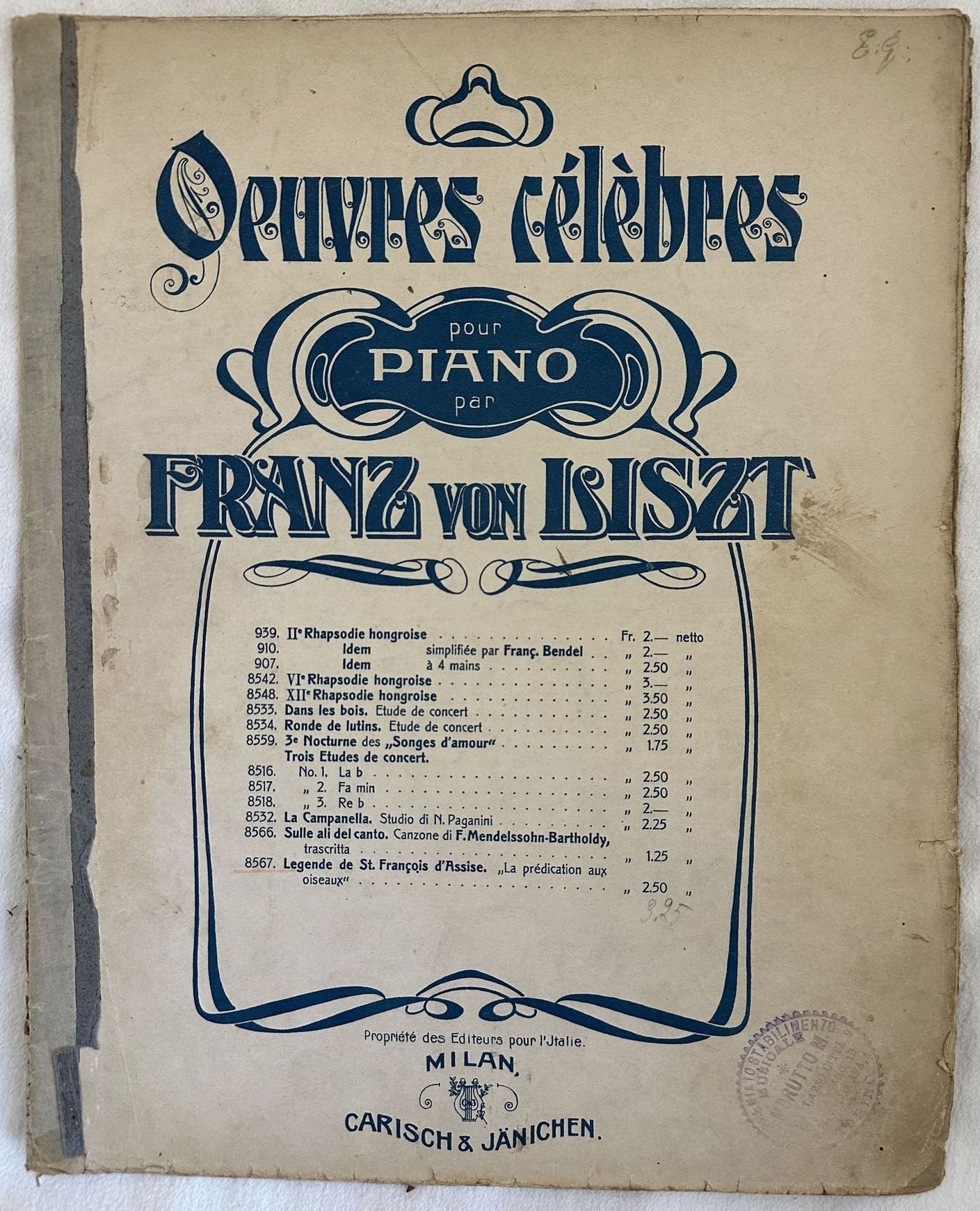 Edizione dei primi del novecento della melodia "Legende de St. Francois d'Assise" di Franz Liszt (1811-1886) dall'opera "Etude de concert". In discrete condizioni. Copertina editoriale in discrete condizioni con lievi usure marginali. Dorso coperto da carta. Legatura editorialmente assente. Pagine in buone condizioni con rare fioriture. In Folio. cm. 34x27,5. Pp. 17.Edition of early 20th century of the melody "Legende de St. Francois d'Assise" by Franz Liszt (1811-1886) from the opera "Etude de concert". In fair conditions. Editorial cover in fair conditions lightly worn in the extremities. Spine covered by paper. Binding is editoriarly missing. Pages in good conditions with occasional foxing. In Folio. cm. 34x27,5. Pp. 17.