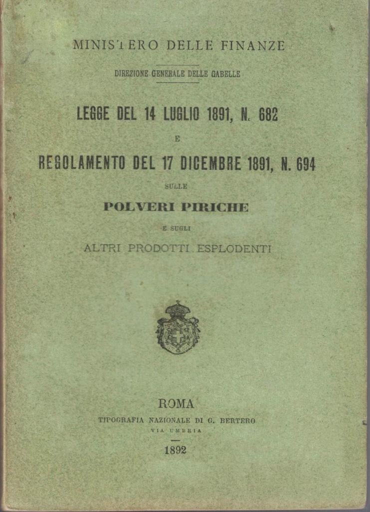 Ministero delle Finanze – Direzione Generale delle Gabelle, Legge del 14 luglio 1891, n. 682 e Regolamento del 17 dicembre 1891, n. 694 sulle polveri piriche e sugli altri prodotti esplodenti, Tipografia Nazionale di G. Bertero, Roma 1892, pp. 138, cm 15, br. ed. A margine di una carta interna, applicato foglietto con bella grafia minuta coeva a integrazione dell’art. 26 del regolamento dell’8 novembre 1889, n. 6517. Sporadiche fioriture, minima brunitura della carta, per il resto perfetto. Raro.