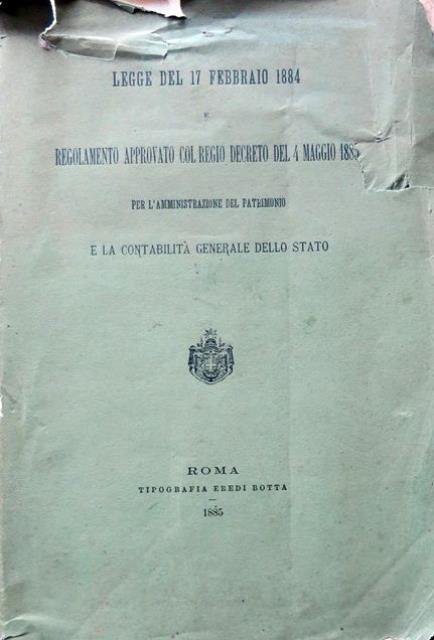 Legge del 17 Febbraio 1884. Regolamento approvato Regio decreto del 4 Maggio 1885 per l’amministrazione del patrimonio e la contabilità generale dello Stato.