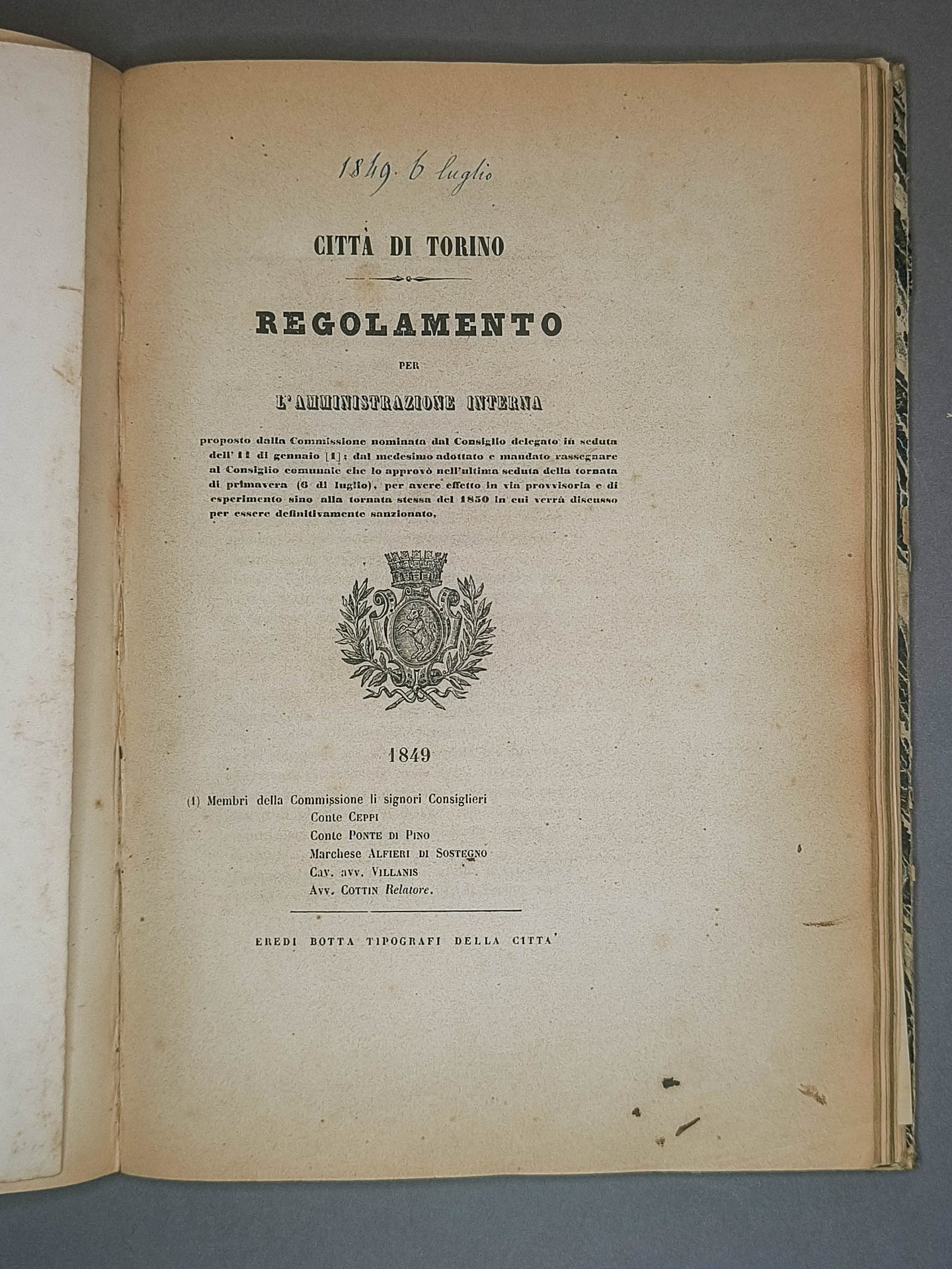 Legge e regolamento comunale - Città di Torino. Regolamento per l'amministrazione interna - Elenco 80 conisglieri del Municipio di Torino (1849, 1850, 1851, 1852, 1854) - Indice manoscritto