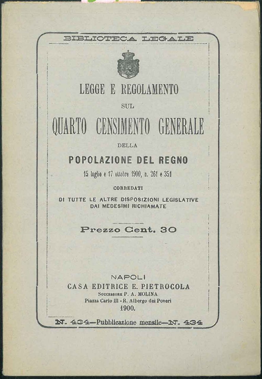 Legge e regolamento sul quarto censimento generale della popolazione del Regno; 15 luglio e 17 ottobre 1900, n. 261 e 351, corredati di tutte le altre disposizioni legislative dai medesimi richiamate