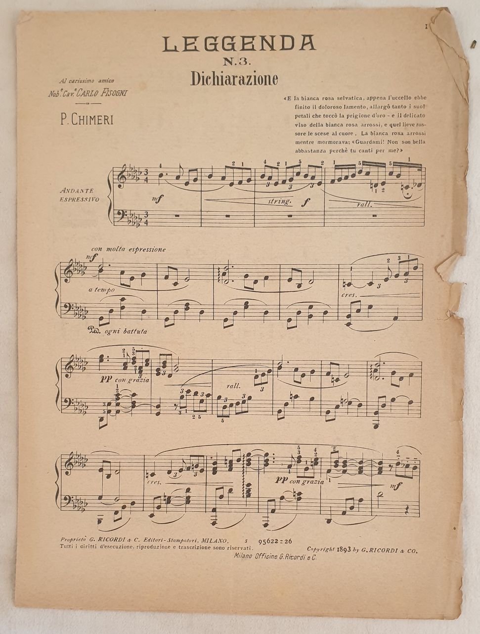 Edizione del 1893 di questo spartito per pianoforte del compositore italiano Paolo Chimeri (1852-1934) "Leggenda n. 3 Dichiarazione". Discrete condizioni. Alcuni strappi marginali e rare fioriture. In 4. cm 32x24. pp. (4). Musical score for piano of the end of 19th early 19th of the musical score for piano "Leggenda n. 3 Dichiarazione" by the italian composer Paolo Chimeri (1852-1934). In 4. cm 32x24. pp. (4). Good conditions. Some tears in the edges and foxings.