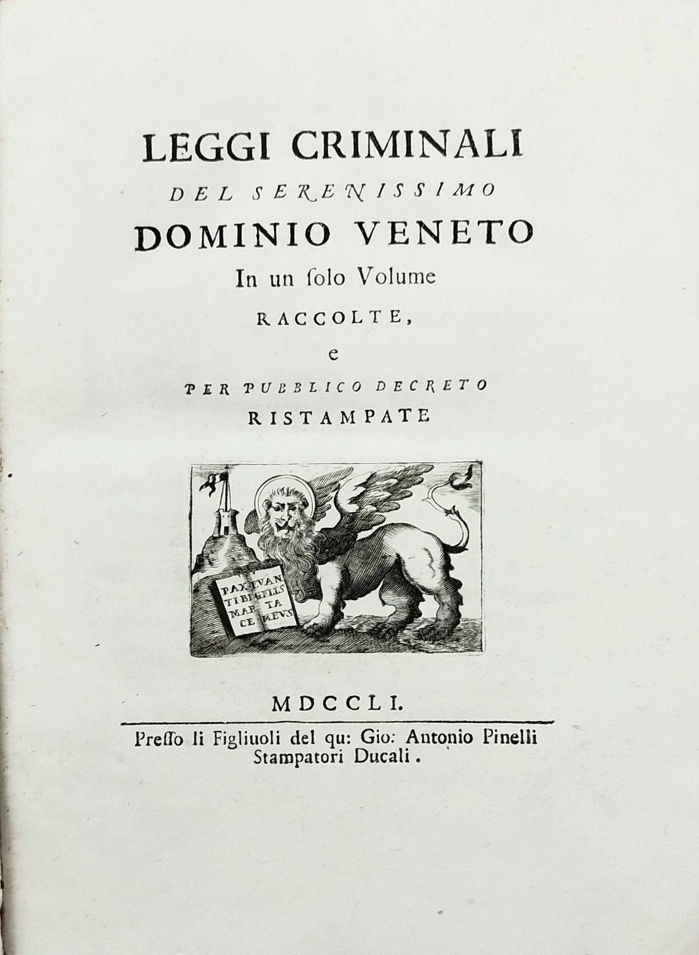 In-4 (24,5 cm)(14) c. 233 c. (1) c. Marca calcografica (Leone di San Marco tiene la zampa sul libro del Vangelo aperto con la scritta: Pax tibi Marce Evangelista meus, sullo sfondo una fortezza) sul frontespizio.Cartiglio editoriale a sostituisce gli ultimi 2 righi della colonna a destra col richiamo "Le". Mezza pelle, tasselli al dorso, caratteri dorati. Edizione originale di questa raccolta delle leggi penali della Repubblica di Venezia promulgate dal 1254 alla data di pubblcazione del codice. Cicogna 1244: "Forma il secondo volume degli Statuti Veneti, a. 1729. Furono anche ristampate, tenuta la stessa data e paginatura. Il compilatore fu Angelo Sabini". (EN) In-4 (24.5 cm) (14) c. 233 c. (1) c. Intaglio mark (Lion of St. Mark holds his paw on the open Gospel book with the inscription: Pax tibi Marce Evangelista meus, in the background a fortress) on the title page. Editorial cartouche a replaces the last 2 lines of the right column with the reference "Le" . Half leather, back patches, golden lettering. Original edition of this collection of the criminal laws of the Republic of Venice promulgated from 1254 to the date of publication of the code. Cicogna 1244: "It forms the second volume of the Venetian Statutes, in 1729. They were also reprinted, keeping the same date and pagination. The compiler was Angelo Sabini".