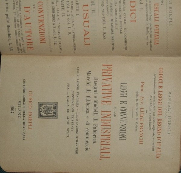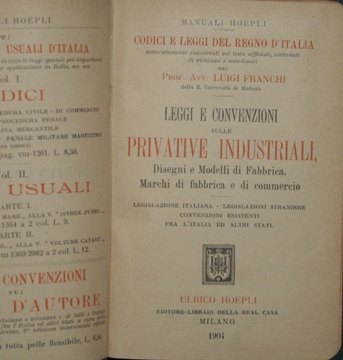 Disegni e modelli di fabbrica, marchi di fabbrica e di commercio - Legislazione italiana. Legislazioni straniere. Convenzioni esistenti fra l'Italia ed altri Stati - Collana Manuali Hoepli. Codici e leggi del Regno d'Italia - in 16° - pp.VIII + 1007 - - Tagli rossi