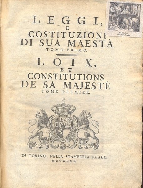 Leggi e Costituzioni di Sua Maestà. Loix et Constitutions de Sa Majeste. Fondamentale raccolta di Leggi promulgate da Carlo III. Interessanti le notizie sugli usi e costumi dell'epoca, considerati sia sotto l'aspetto della vita pubblica che di quella privata. Manno I 2788.